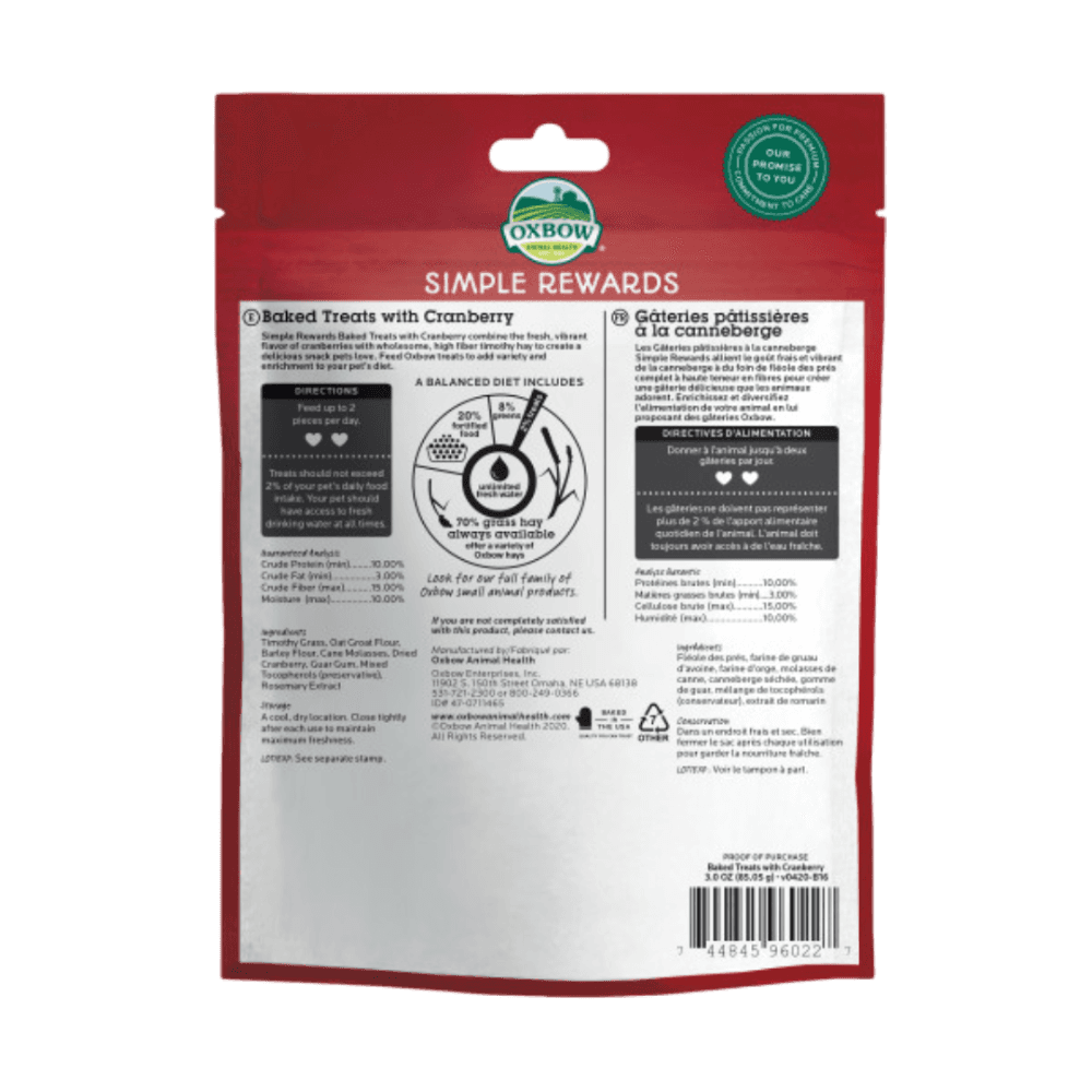 Timothy Grass, Oat Groat Flour, Barley Flour, Cane Molasses, Dried Cranberry, Guar Gum, Mixed Tocopherols (preservative), Rosemary Extract.