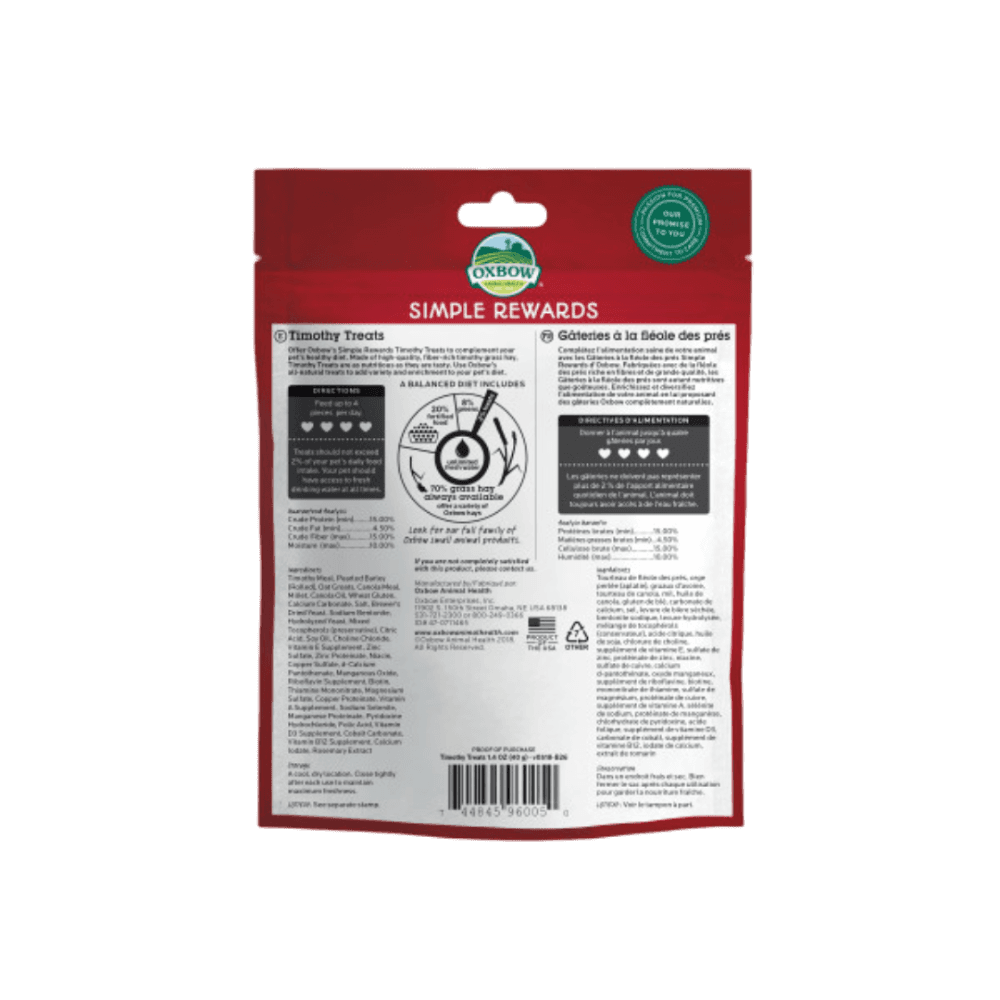 Offer your small pet a wholesome and healthy reward with Oxbow Simple Rewards Timothy Treats. These fibre-rich treats are crafted primarily from Timothy grass hay, providing the fresh flavour and aroma small animals adore, while adding variety and enriching their daily diet.