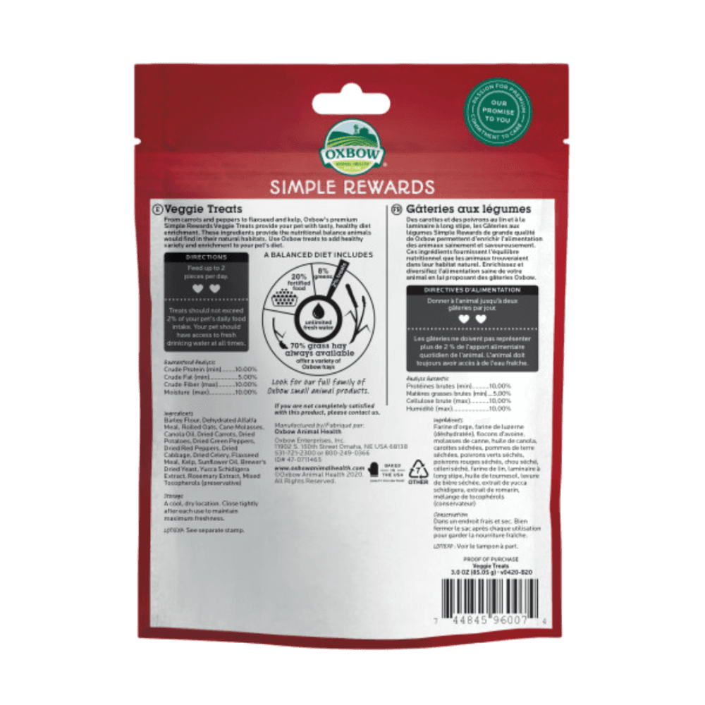 Offer your small pet the wholesome goodness of the garden with Oxbow Simple Rewards Veggie Treats. These oven-baked delights combine a blend of wholesome vegetables and greens, providing a tasty and enriching reward that helps balance your pet's diet.