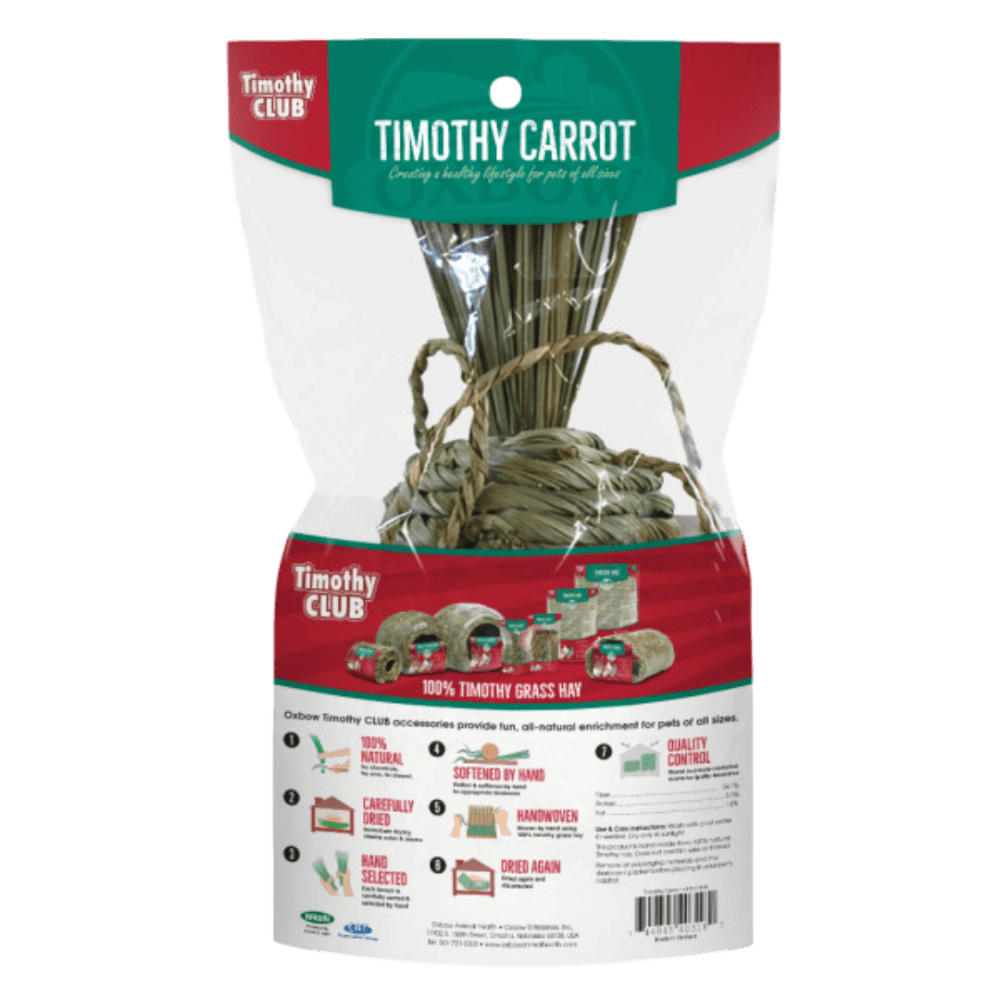 Offer your small pet a fun, enriching, and completely edible accessory with Oxbow Timothy Carrot Natural Chew. Hand-woven from 100% pure, premium Timothy hay, this natural chew is a beneficial source of fibre and an ideal way to encourage natural foraging and chewing behaviours in your rabbit, guinea pig, or chinchilla.