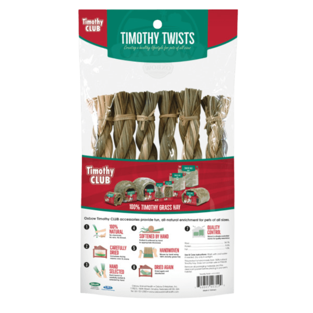 Offer your small pet an enticing and completely edible accessory with Oxbow Timothy Hay Twists. These hand-woven, fun, and tasty twists are crafted from 100% pure, premium Timothy hay, making them a versatile and beneficial addition to your rabbit or guinea pig's daily enrichment.