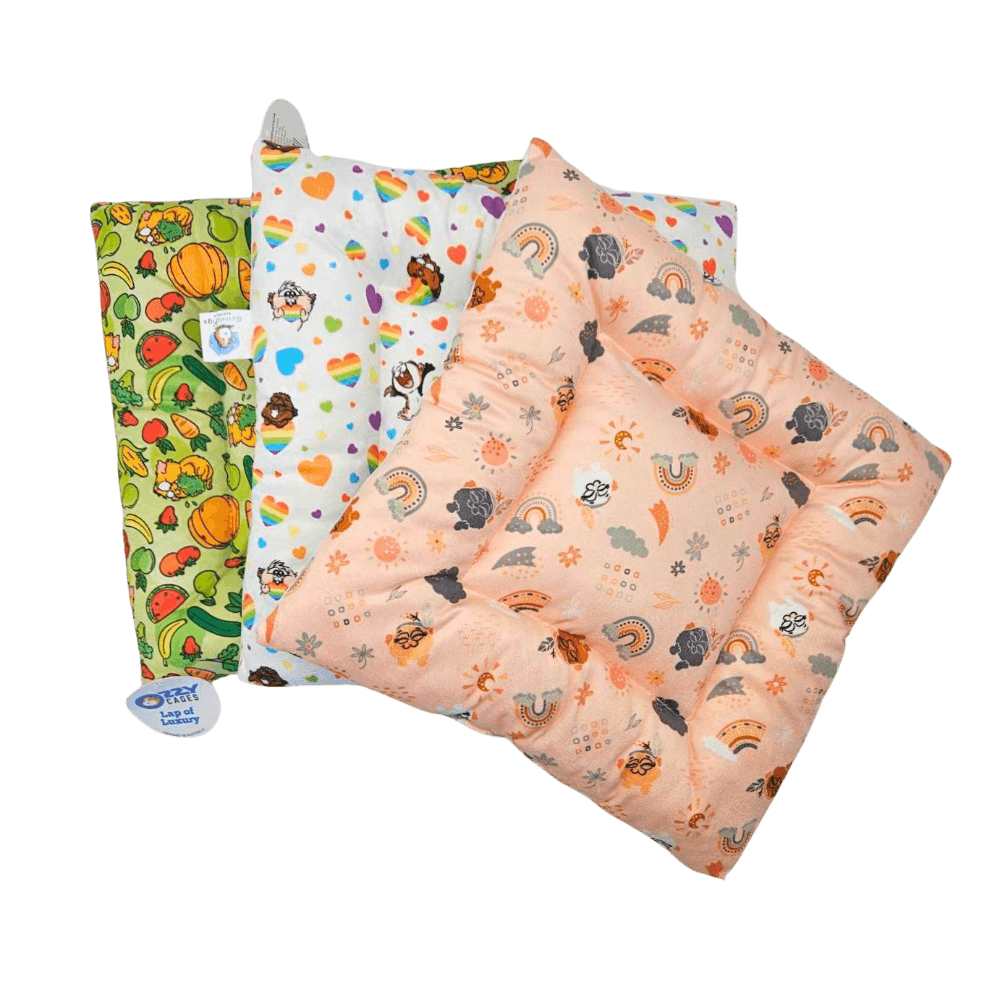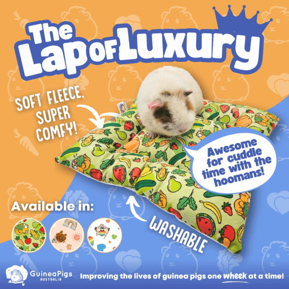 The Lap of Luxury Lap & Pee Pad offers a plush and cozy space for bonding with your guinea pig or rabbit, while also serving as a highly absorbent and odor-resistant corner pee pad for their cage. It features double stitching, a sturdy inner core, and is machine washable. Designed with a unique fleece pattern by Australian artist Katy Harris, it complements the Ozzy Cage Liner range.