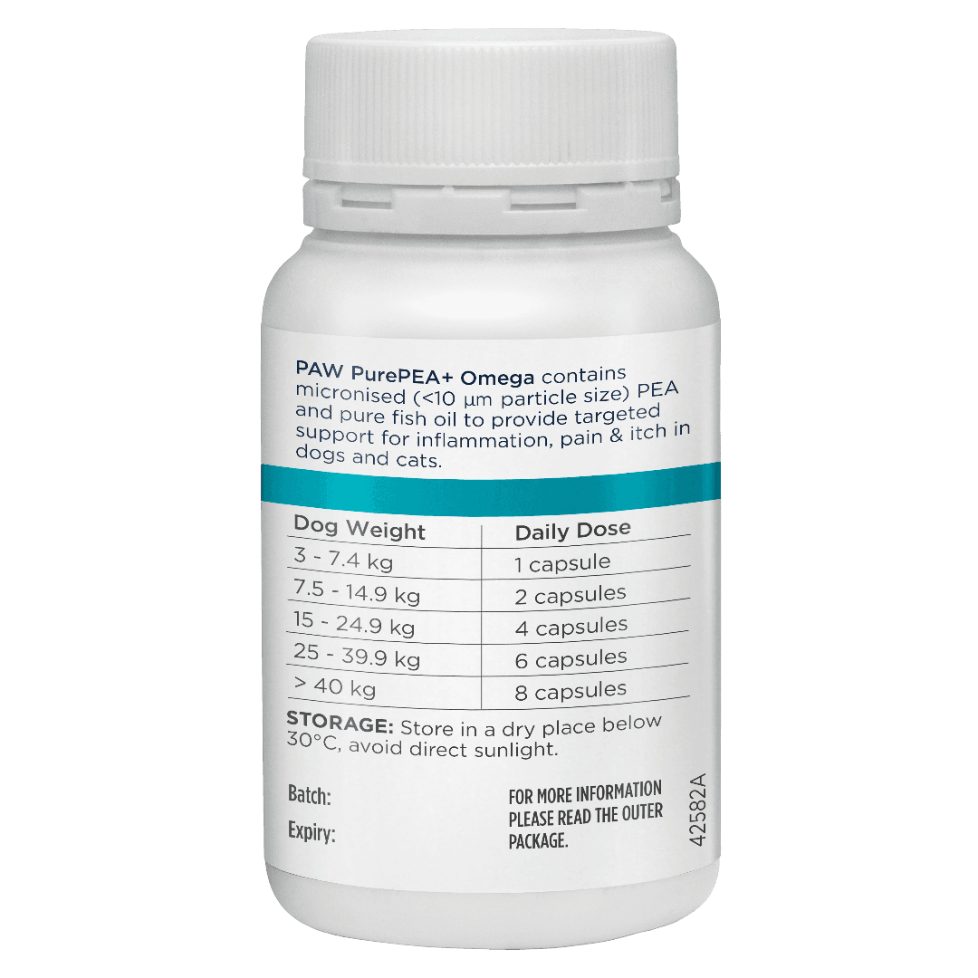 The Paw By Blackmores Pure Pea Plus Omega Capsules For Dogs And Cats is a veterinary-formulated supplement designed to provide relief from allergic skin conditions, chronic pain, and inflammation. This advanced formula combines high-purity, micronised Palmitoylethanolamide (PEA) with fish oil to naturally support your pet's own healing processes.