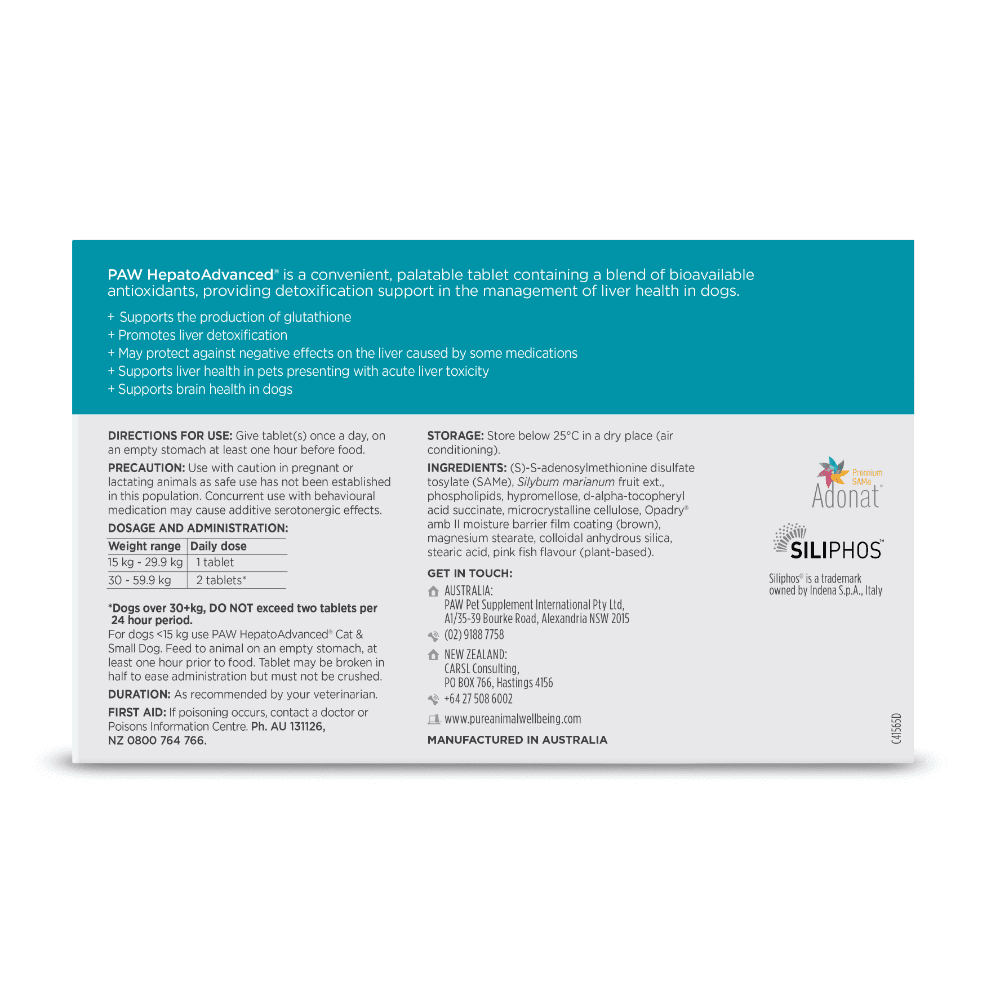 Paw Blackmores Hepatoadvanced tablets are designed to support liver health in your canine companions over 15kg. With a blend of S-adenosylmethionine (SAMe), Silybin, and Vitamin E, these chewable fish-flavoured tablets are crafted to enhance and maintain your dogs liver function.