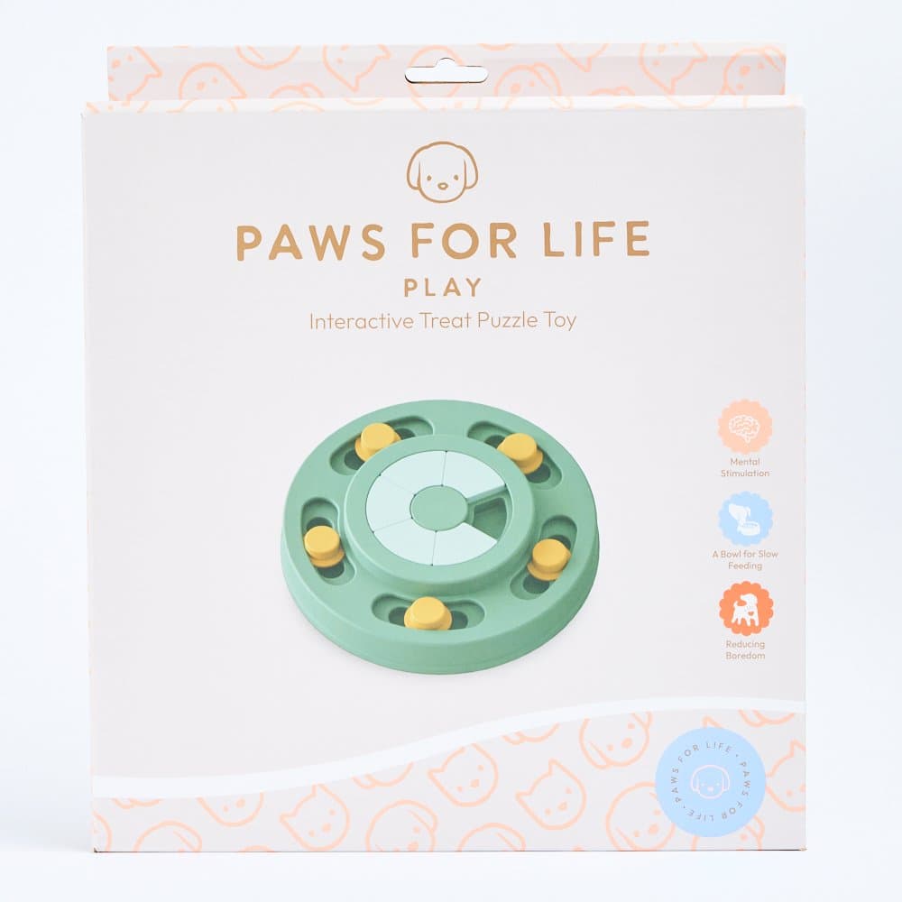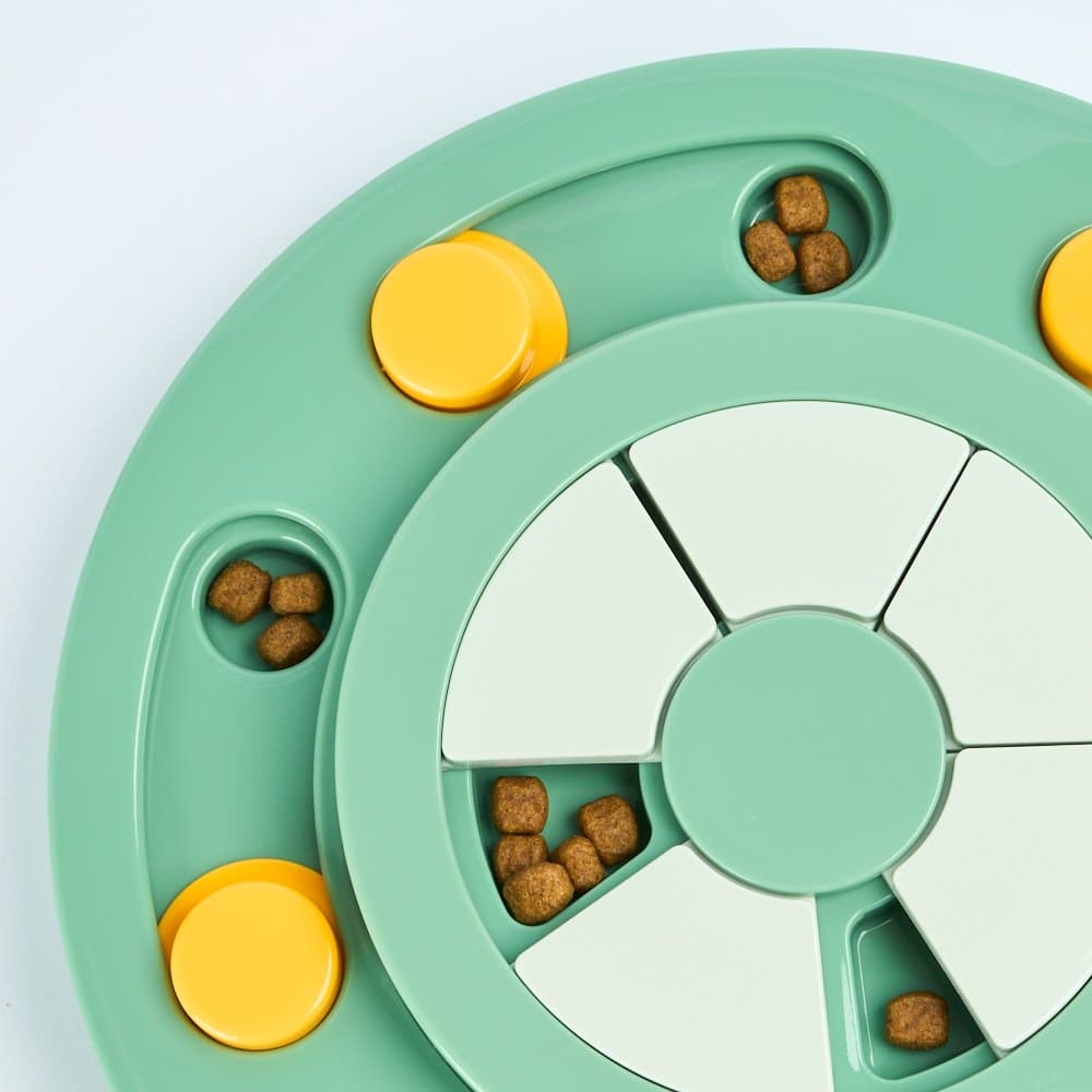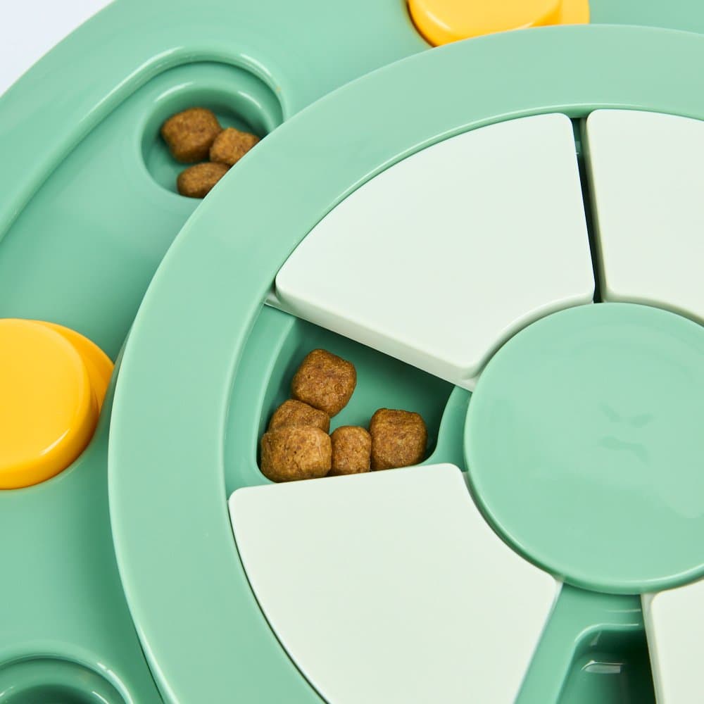 The Paws For Life 2 Tier Interactive Treat Puzzle Activity Dog Toy in Green makes treat time a fun brain game for your dog. Its two-tier design with sliding and spinning sections challenges your pup's problem-solving skills and helps to slow down fast eaters.