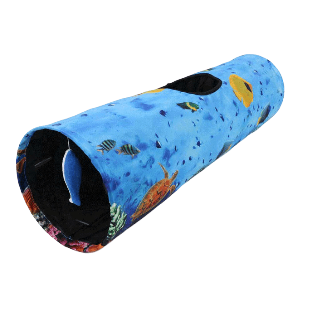 Transform your cat's playtime into a whimsical underwater adventure with the Paws for Life Cat Tunnel. Featuring an engaging sea-inspired design, this tunnel is packed with exciting features to keep your cat entertained for hours. With a crackling texture, a playful fish toy, and a peephole for interactive exploration, your cat won't be able to resist this ocean-themed play zone!