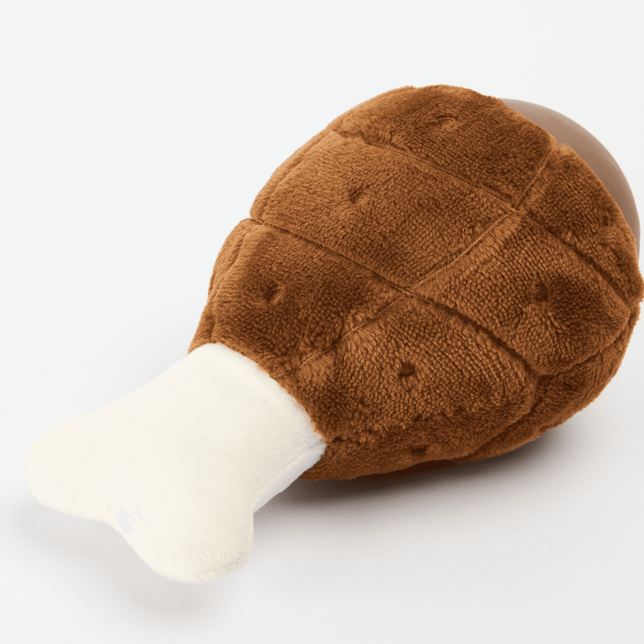 - Incorporates a dual-function design with a plush chicken leg top and a sturdy treat-dispensing base