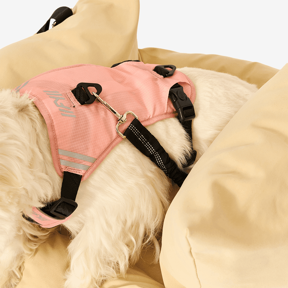 - Adjustable safety belt easily converts into a leash for secure car rides