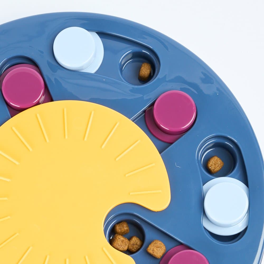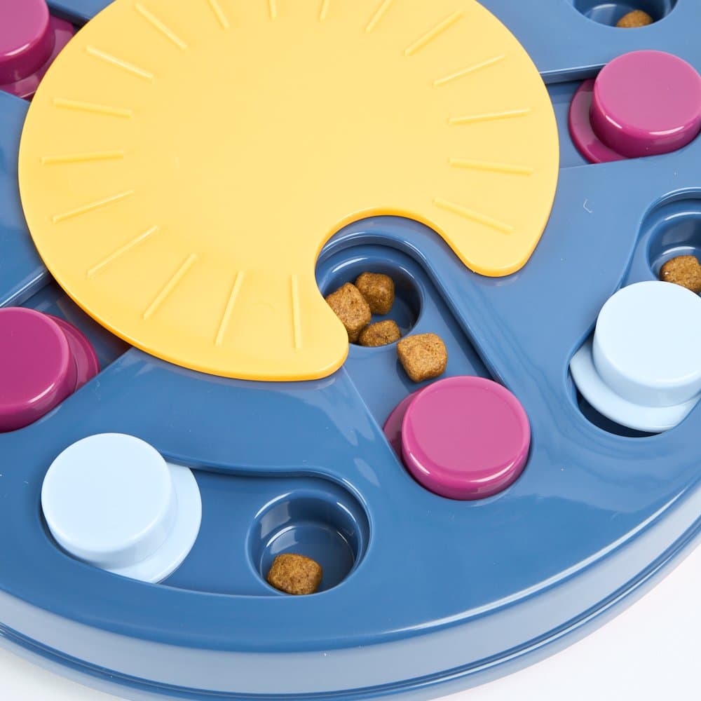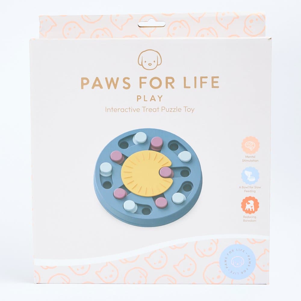 The Paws for Life Interactive Treat Seek Puzzle Blue transforms mealtime into a stimulating, brain-boosting game for your dog. This interactive feeder challenges your pet to slide panels and spin a disc to find hidden treats, helping to slow down fast eaters and reduce boredom.