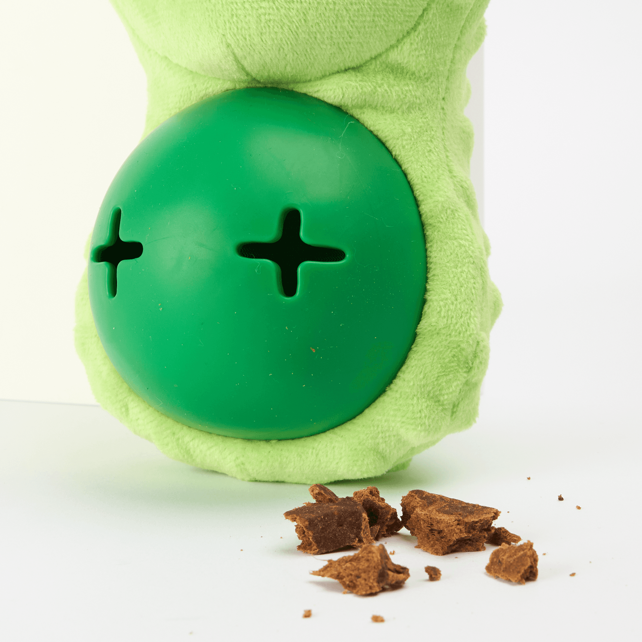 - Features a unique 2-in-1 design with a soft plush body and a textured TPR treat-dispensing back