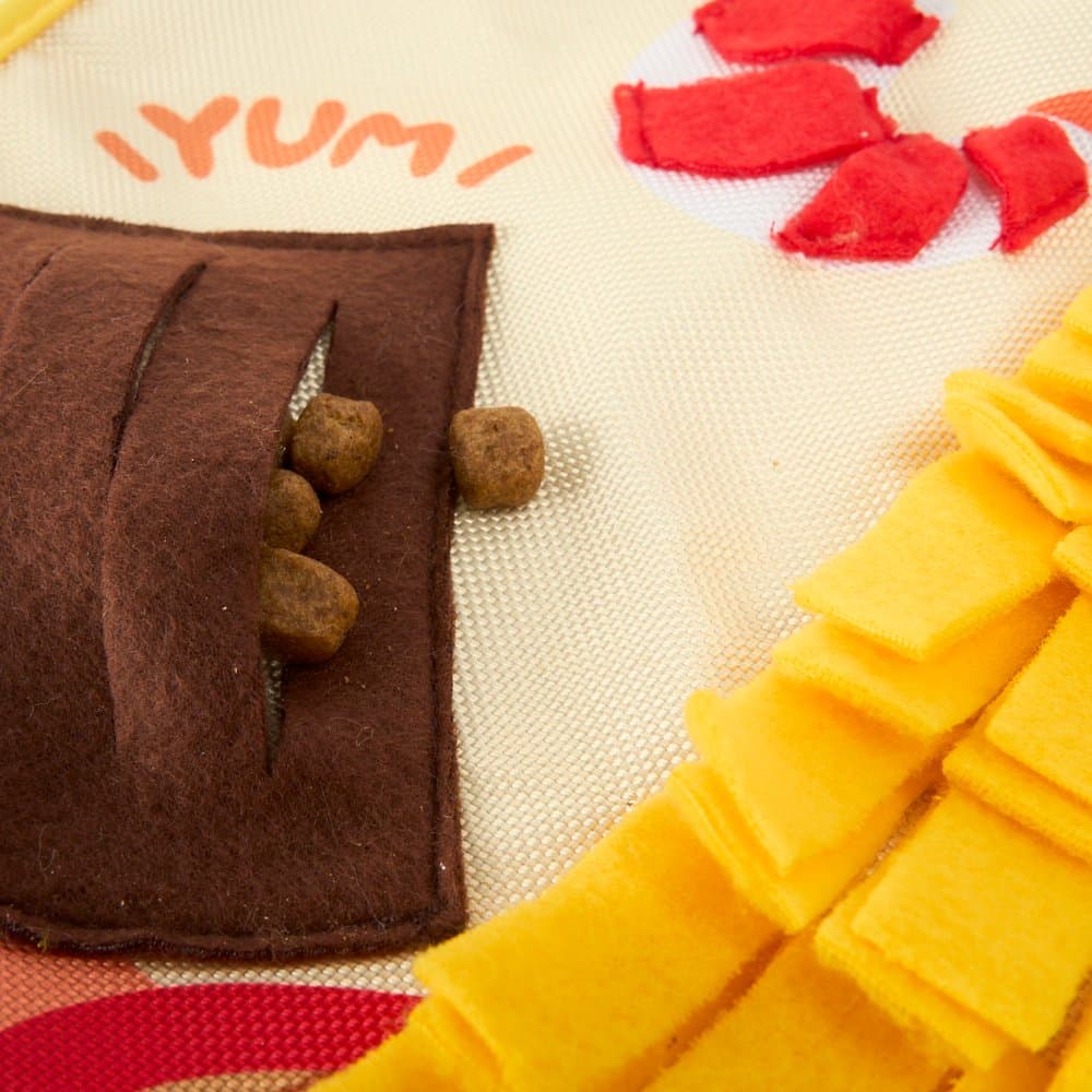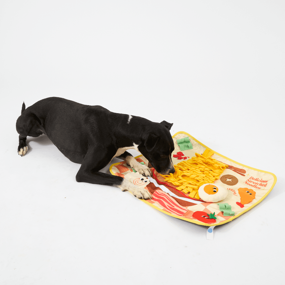 The Paws for Life Ramen Noodle Dinner Interactive Snuffle Mat for Dogs turns mealtime into a fun and delicious foraging adventure. This ramen-themed mat challenges your dog's natural instincts by letting them sniff and search for treats hidden amongst the soft fleece noodles and garnishes.