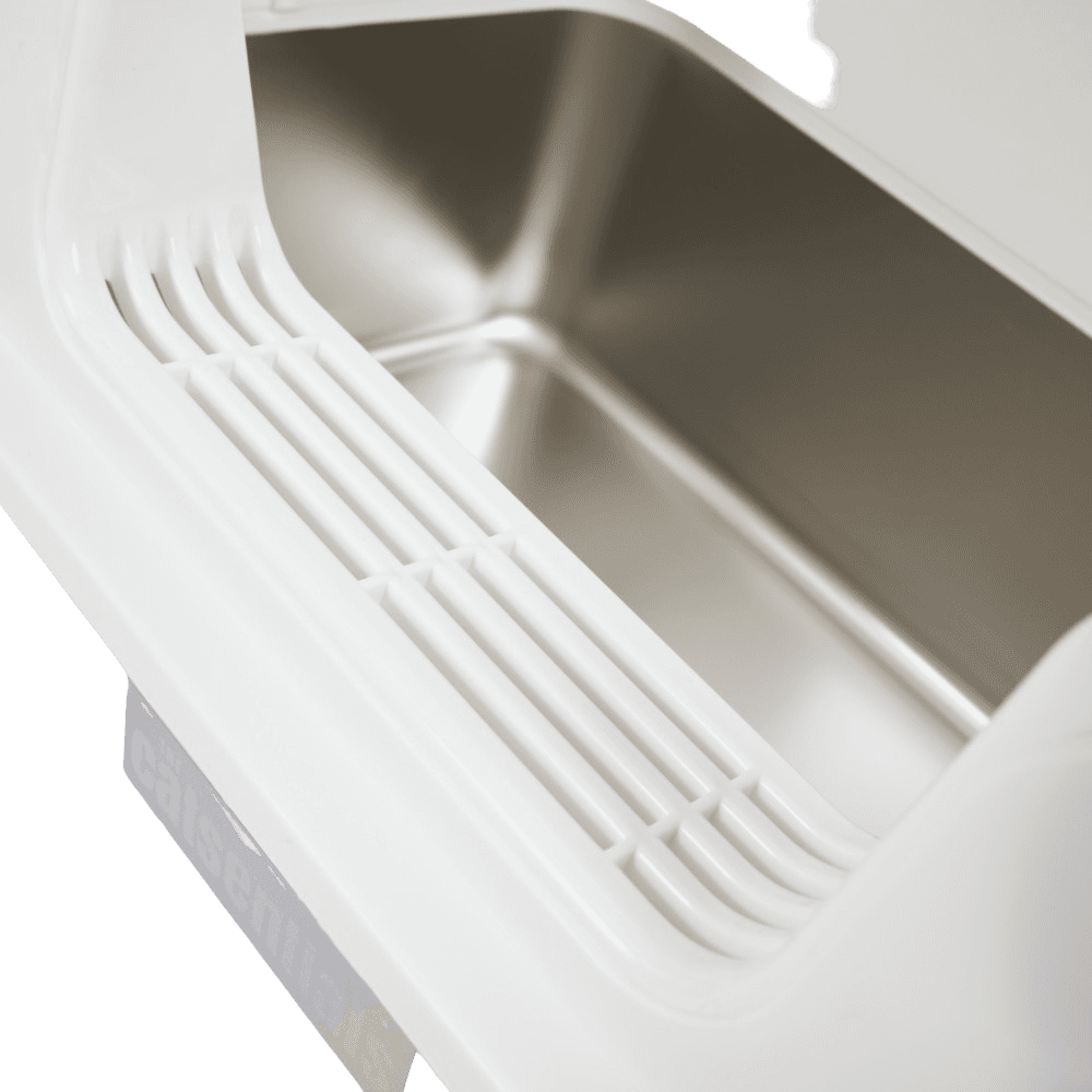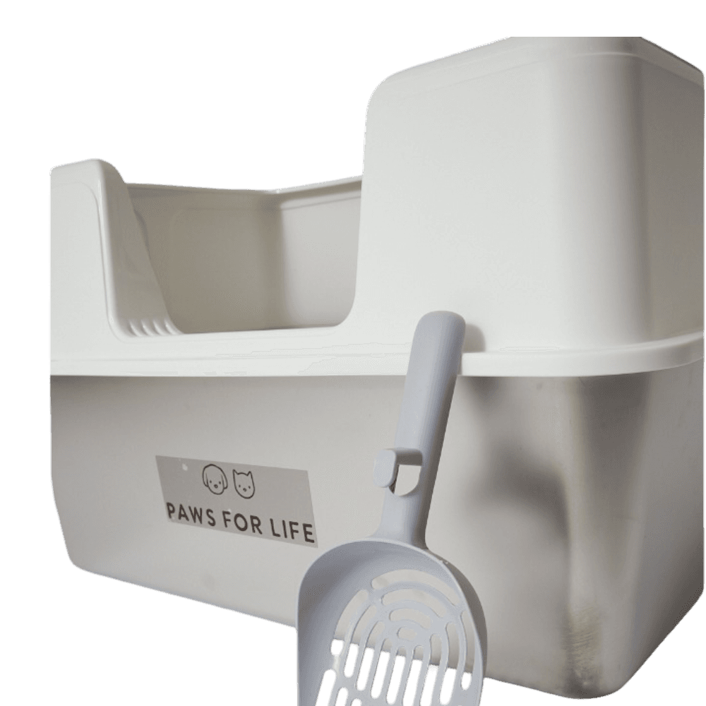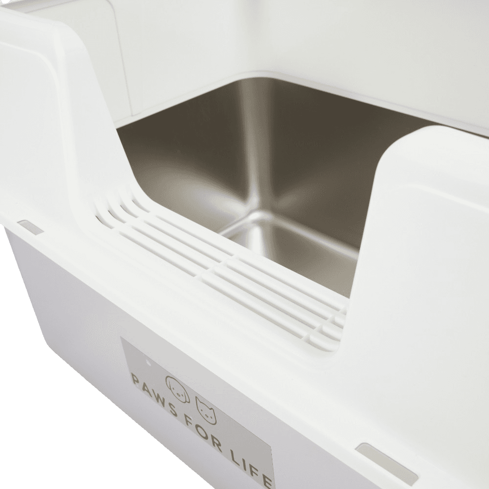 Paws for Life Front-Opening Stainless Steel Cat Litter Box in white offers a sleek and functional solution for keeping your cat's litter area tidy. With high sides and an open-top design, it effectively contains litter and minimizes mess, ensuring a comfortable and private space for your furry friend.