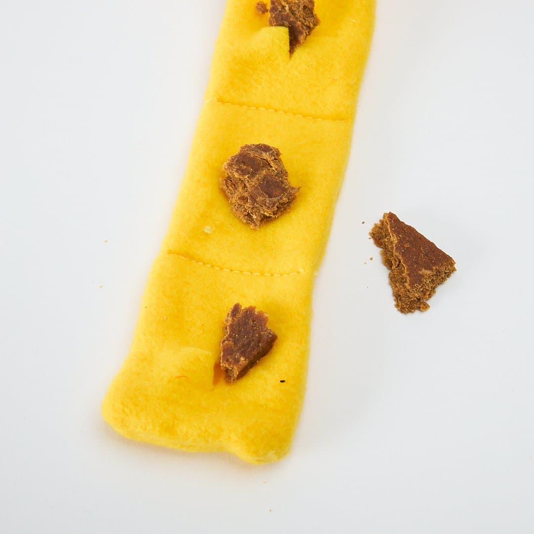 - To use, simply fill the tail pockets with small dry treats and let your dog unroll the surprise