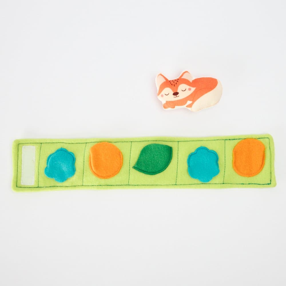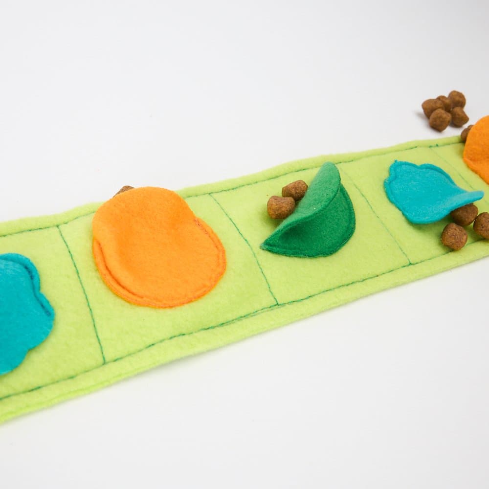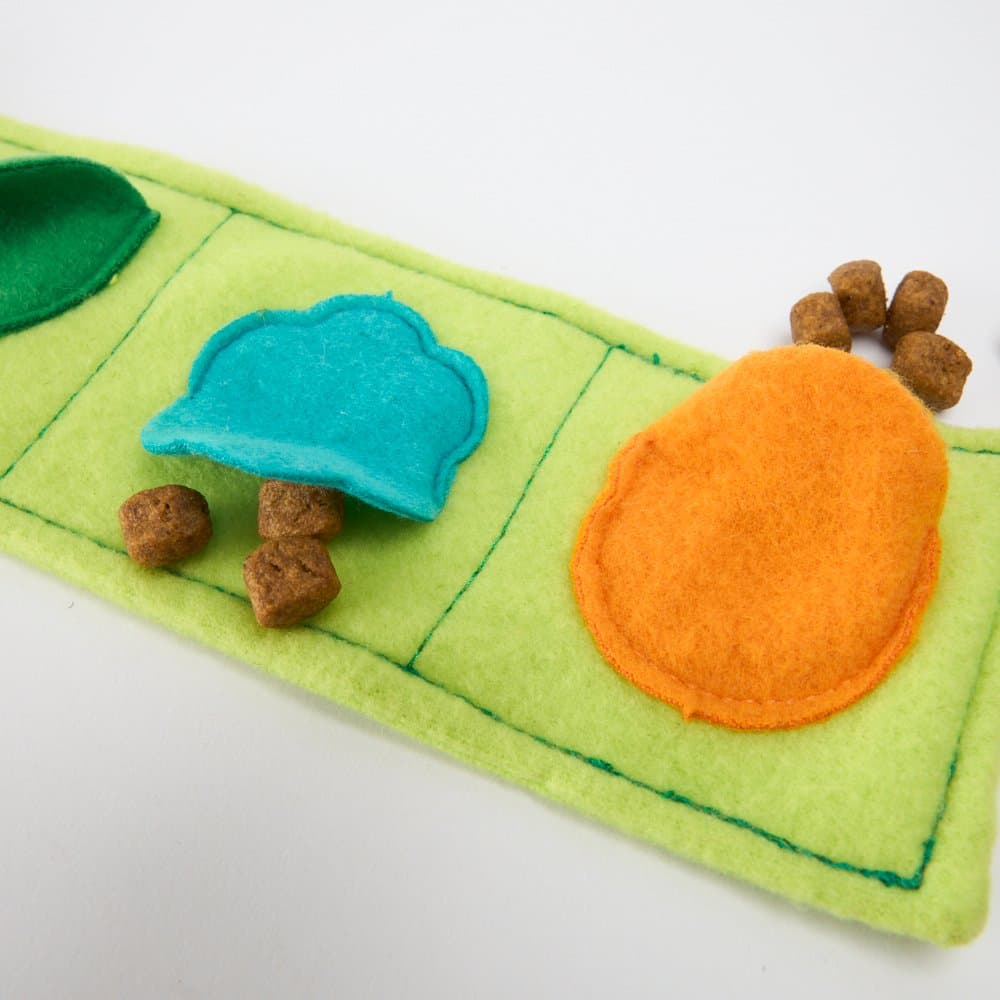 - Tuck dry treats or kibble between the fabric folds and inside the stump for layered fun
