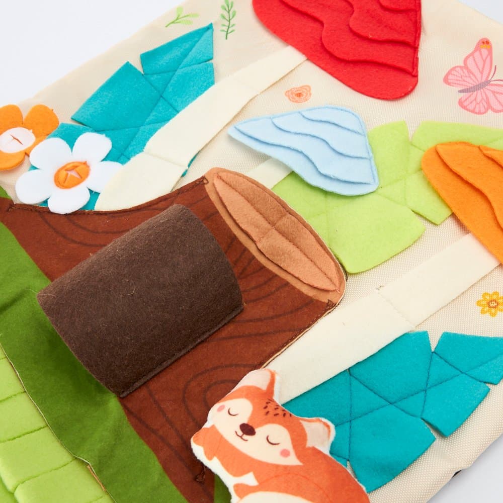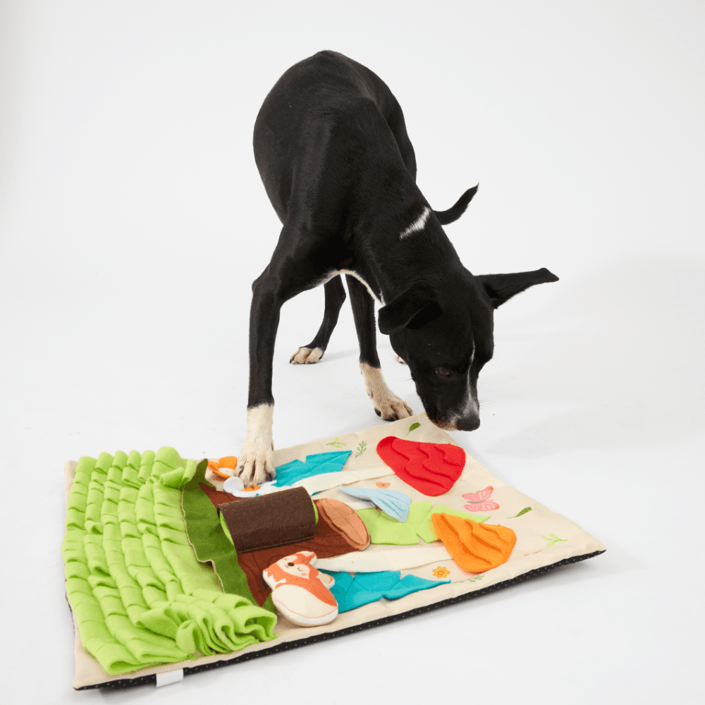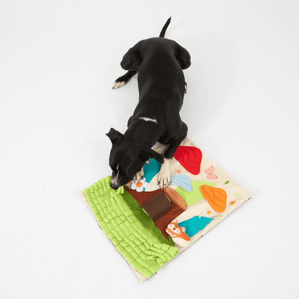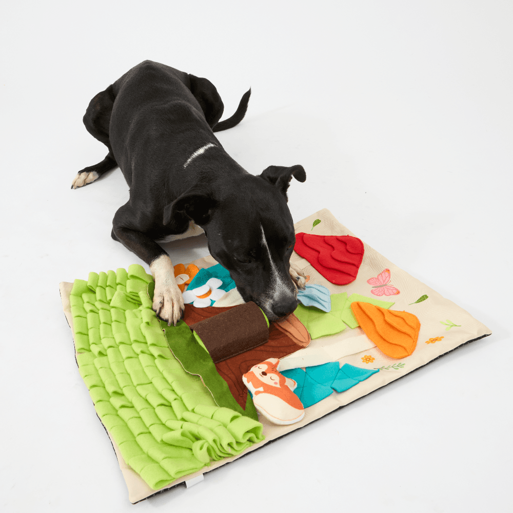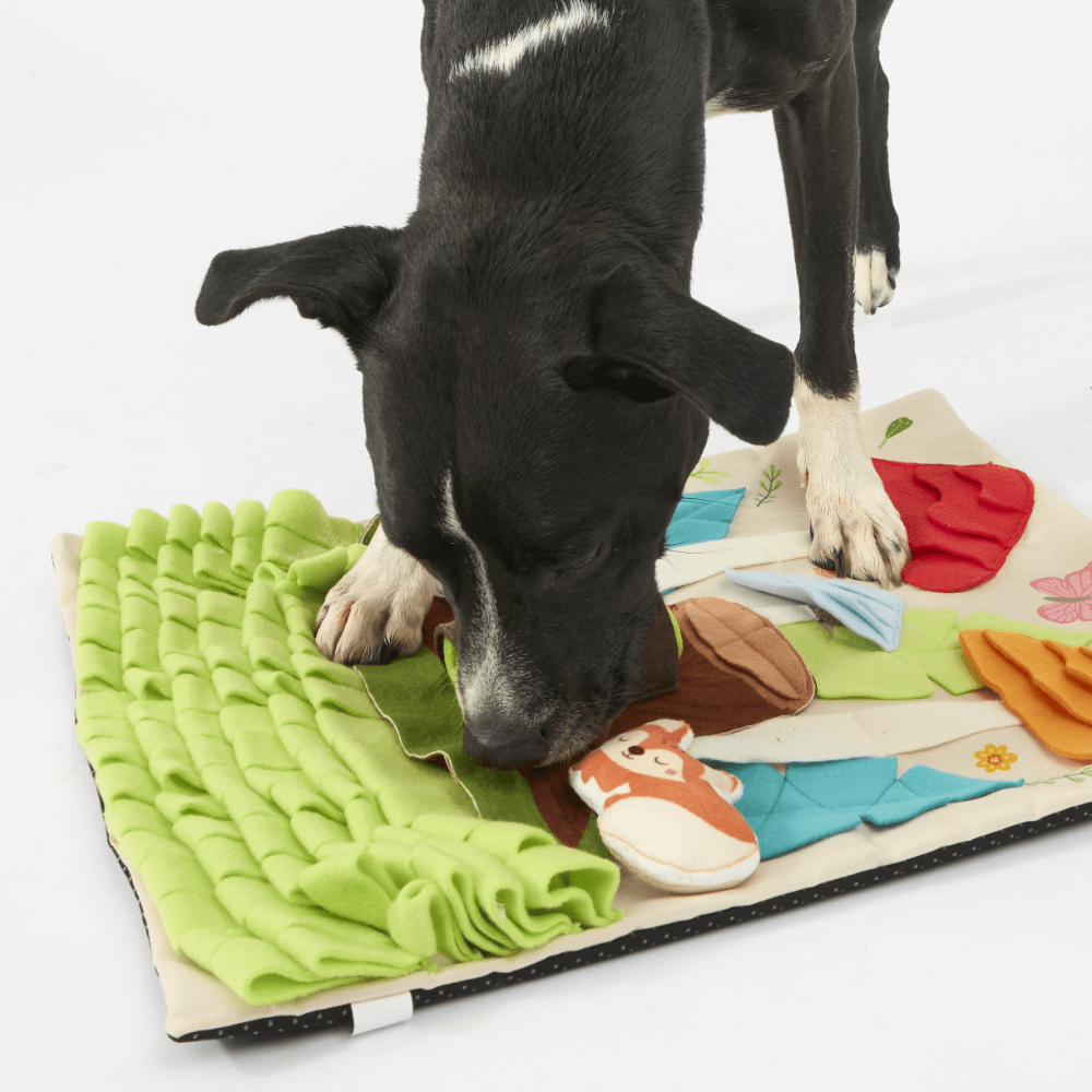 The Paws for Life Tree Stump & Mushroom Forest Interactive Dog Snuffle Mat is a magical woodland romp where every sniff from your dog can uncover hidden treats. This engaging mat features layered fleece grass, squeaky mushrooms, and a removable tree stump, offering multiple challenges for a fun foraging adventure.