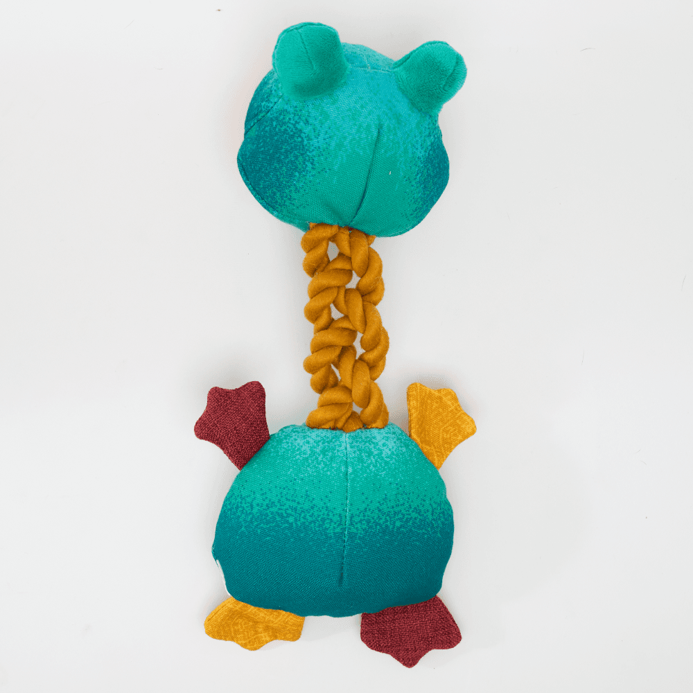 The Paws for Life Canvas Frog with Rope Legs Dog Toy is designed to provide interactive fun for your furry friend. This engaging toy combines a durable canvas body with sturdy rope neck and two internal squeakers, making it perfect for exciting games of tug and chew.