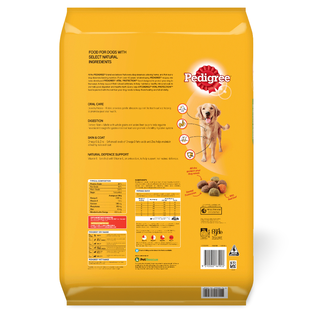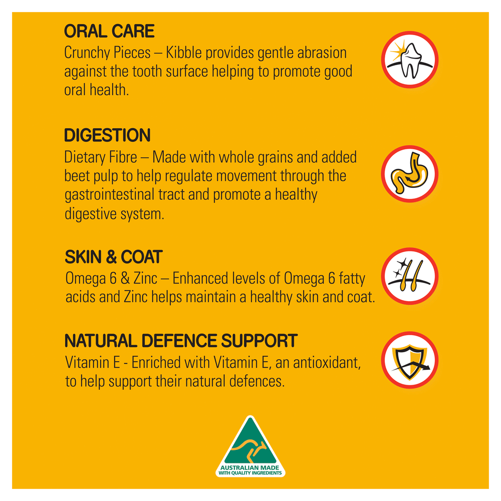 Cereals &/or cereal by-products, meat & meat by-products (poultry, beef &/or lamb), poultry palatant, vegetables, beet pulp, iodised salt, minerals (iron, zinc, copper, potassium and selenium), sunflower oil, vitamins (A, D3, E, B1, B2, B3, B5, B6, B9, B12 and choline), amino acid, antioxidants