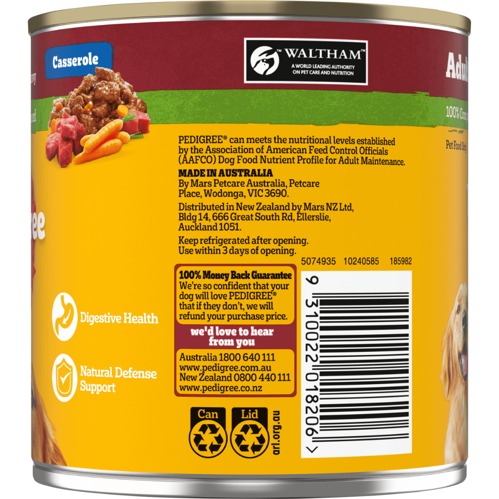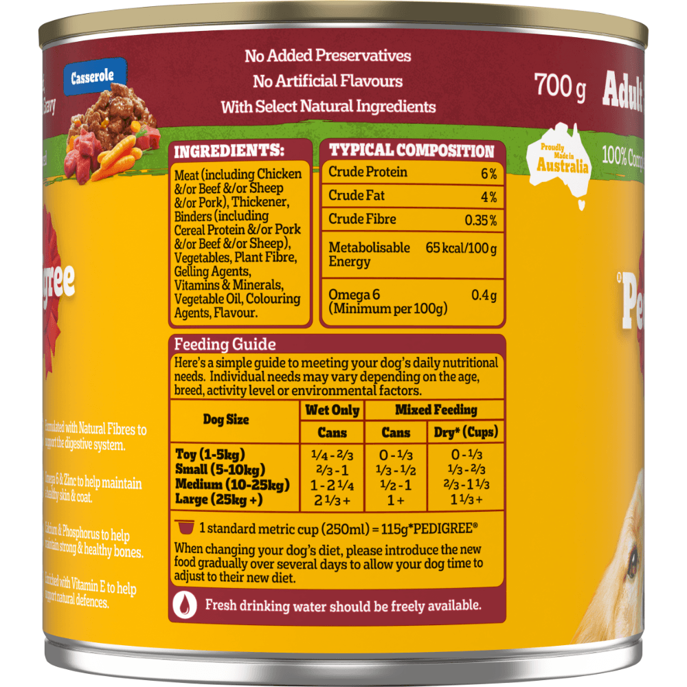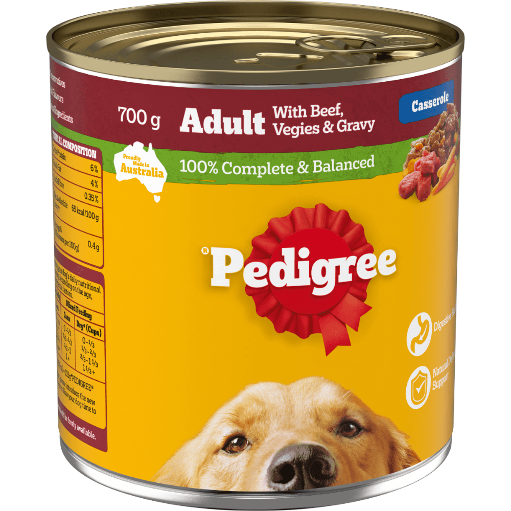 Treat your adult dog with Pedigree Adult Wet Dog Food Beef Vegies Gravy Casserole, a delicious and nutritious meal designed for adult dogs.This recipe features tender chunks of real beef, complemented by wholesome vegetables, all smothered in a rich, savoury gravy. It's a complete and balanced meal that supports your dog's health while satisfying their taste buds.