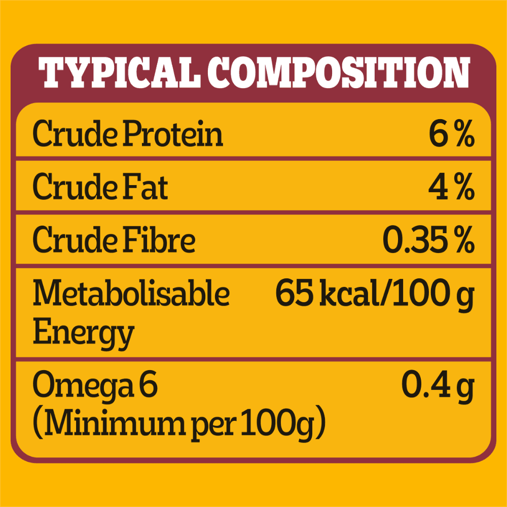 Meats (Chicken, Beef, Sheep &/or Pork); Thickener; Binders (Gluten, Beef &/or Sheep); Vegetable; Vegetable Fibre; Gelling Agents; Colouring Agents; Sunflower Oil; Minerals; Vitamins and Flavours (including Garlic).
