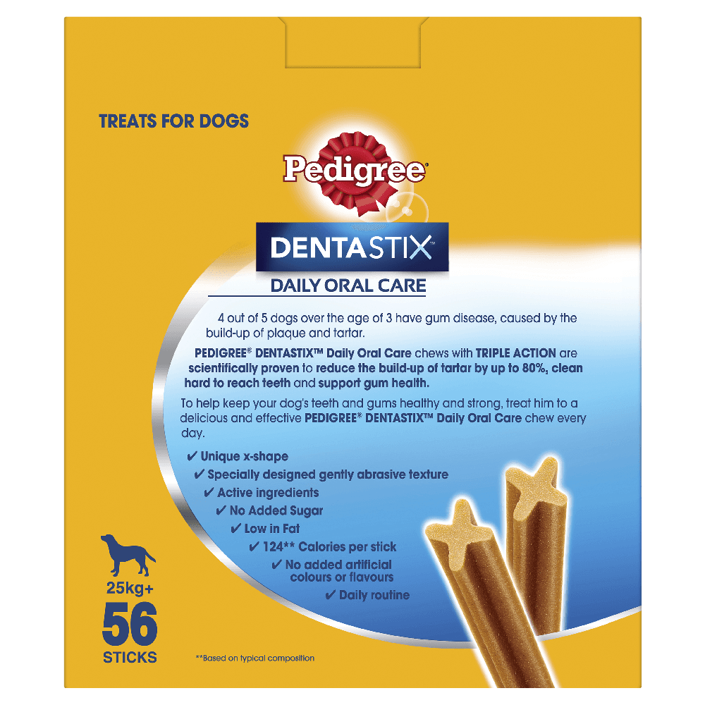 Pedigree Dentastix Daily Dental Large Dog Treats are specially crafted to support your large breed dog's dental health while doubling as a tasty daily treat. Designed with a unique X-shape and abrasive texture, these dental chews help clean teeth in hard-to-reach areas and reduce tartar build-up when fed daily.