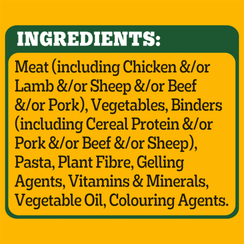Meats (Chicken, Lamb &/ or Sheep, Beef &/ or Pork); Vegetables; Binders (Gluten, Beef &/ or Sheep); Pasta; Vegetable Fibre; Geiling Agents; Colouring Agents; Sunflower Oil; Minerals; Vitamins and Flavour.