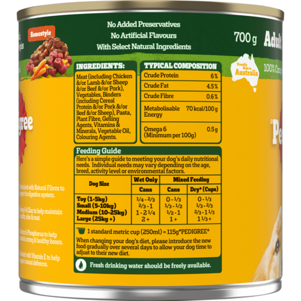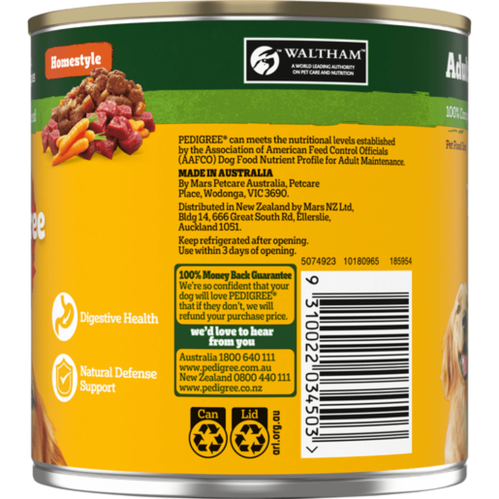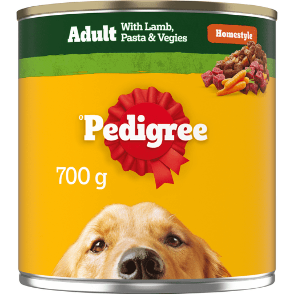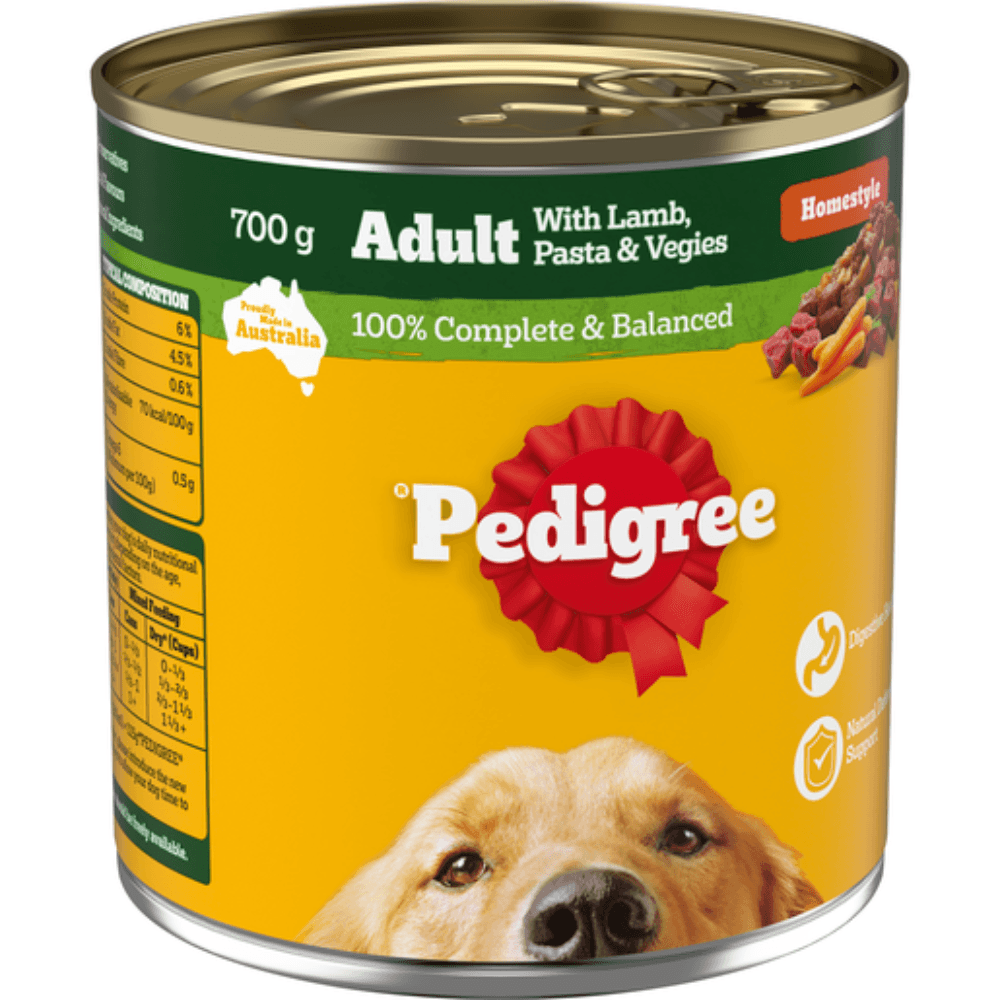 Feed your adult dog Pedigree Lamb Pasta Vegies Cans, a hearty and nutritious meal made with real lamb, pasta, and a variety of vegetables, all simmered in a delicious gravy. This recipe is specially crafted to support your dog's health, providing a balanced meal with high-quality protein, fibre, and essential nutrients to keep them healthy and satisfied. Offering complete nutrition developed with Waltham Institute experts. Pedigree provides trusted, quality meals.