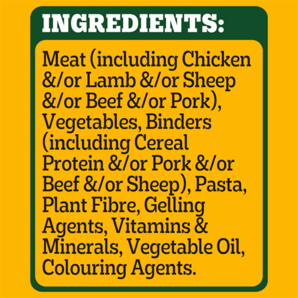 Chicken, lamb, beef &/or pork; vegetables; gelling agents; cereal; pasta; gluten; vegetable fibre; amino acids; colouring agents; minerals; flavours; sunflower oil & vitamins