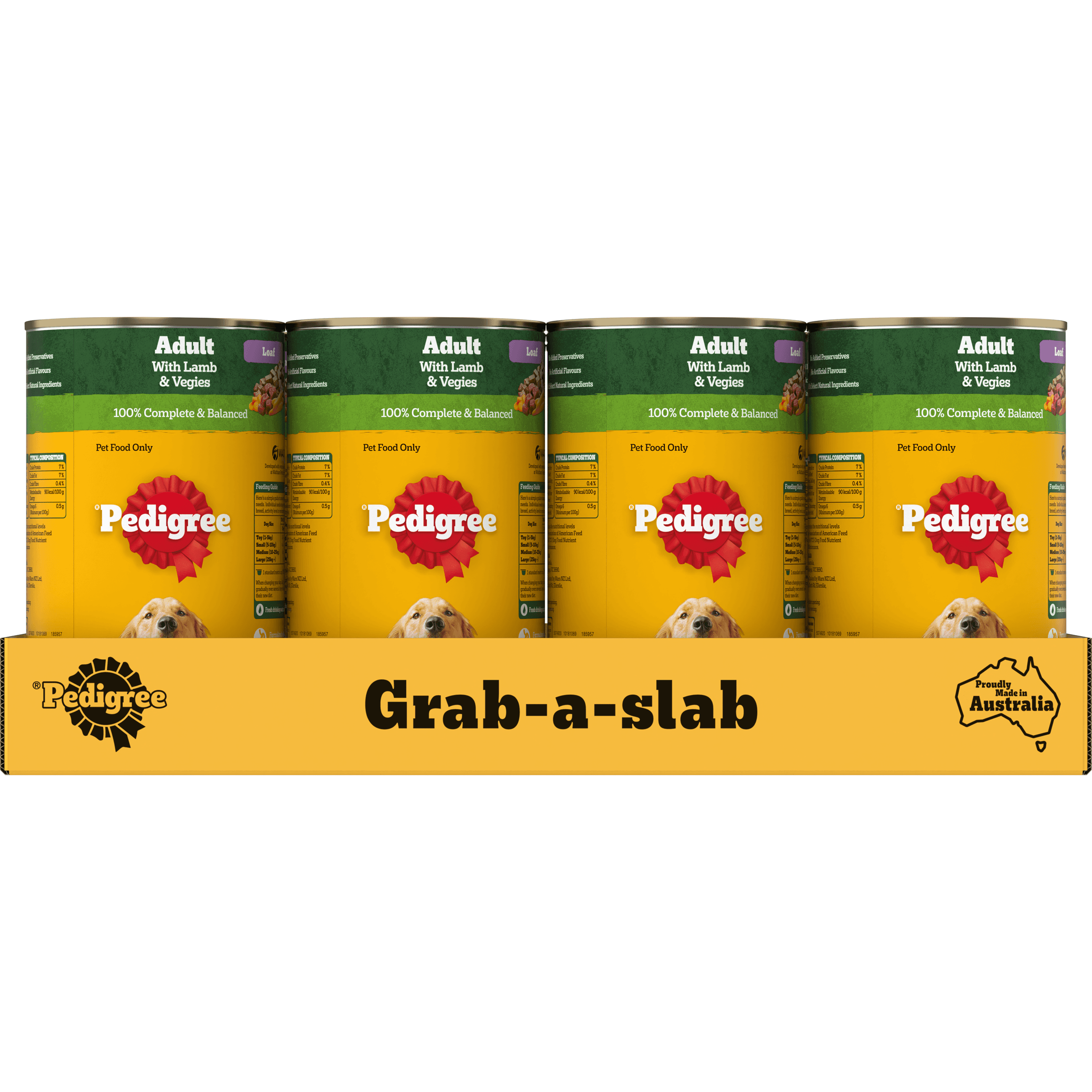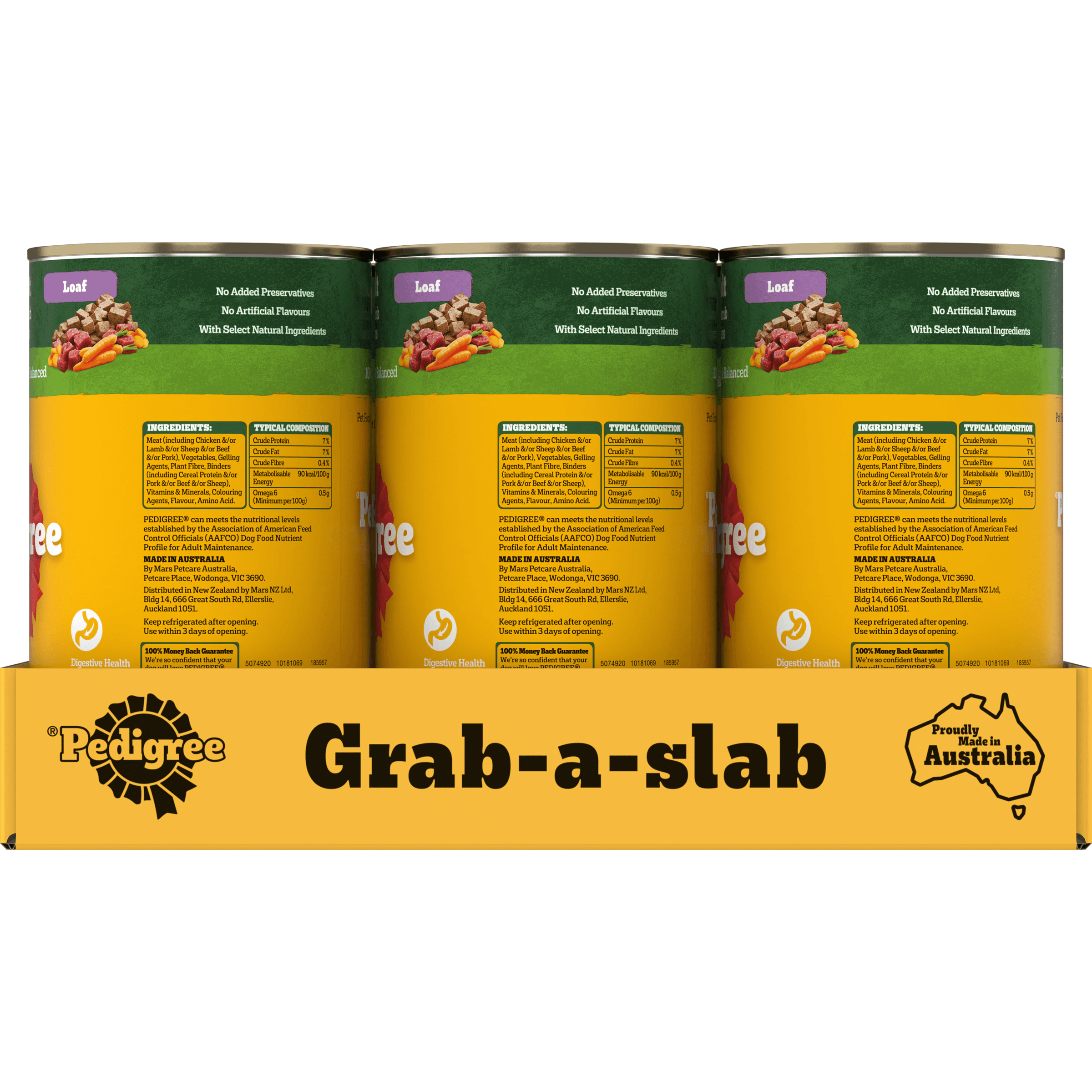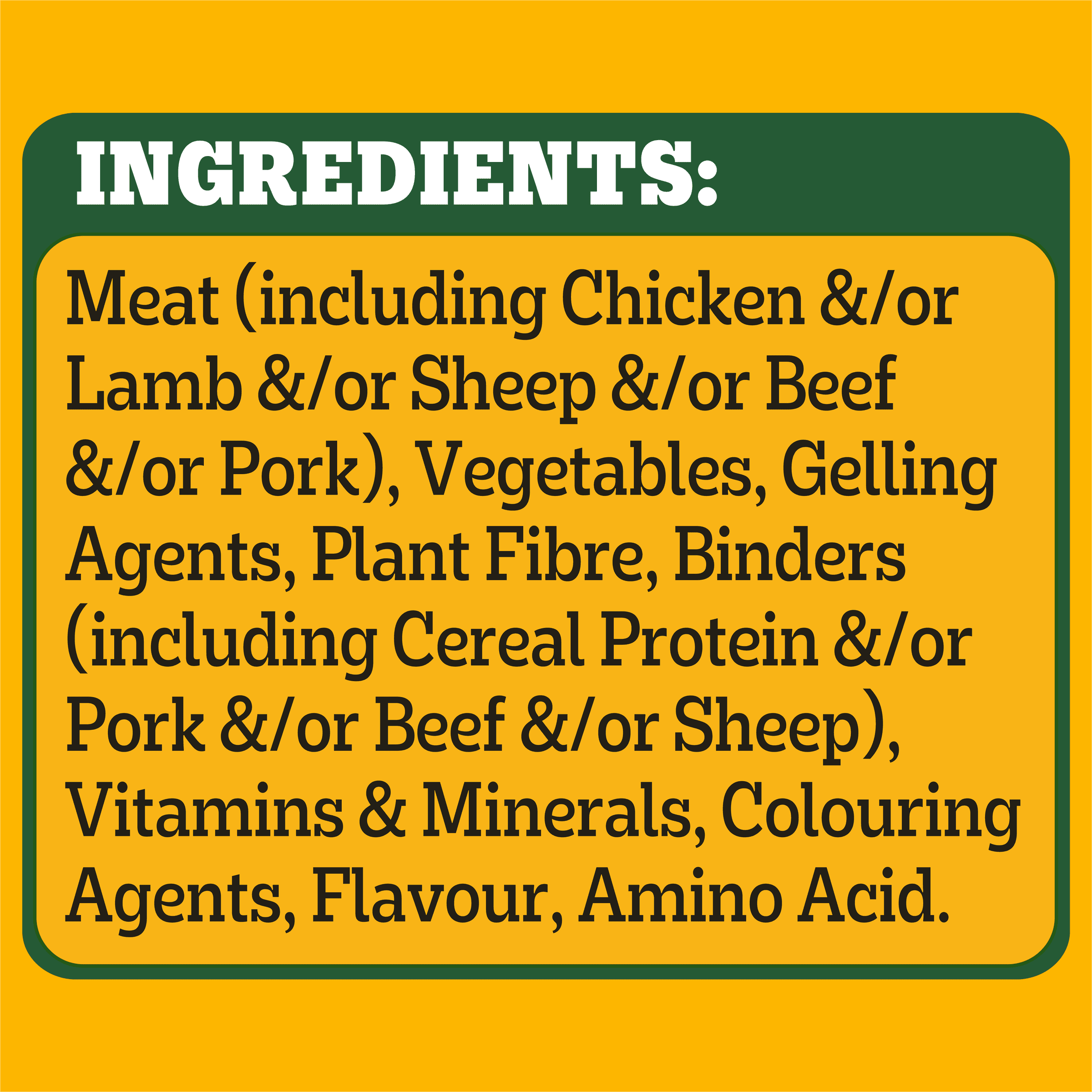 Chicken, lamb, beef &/or pork; vegetables; gelling agents; cereal; vegetable fibre; gluten; minerals; colouring agents; sunflower oil; flavours; amino acids & vitamins