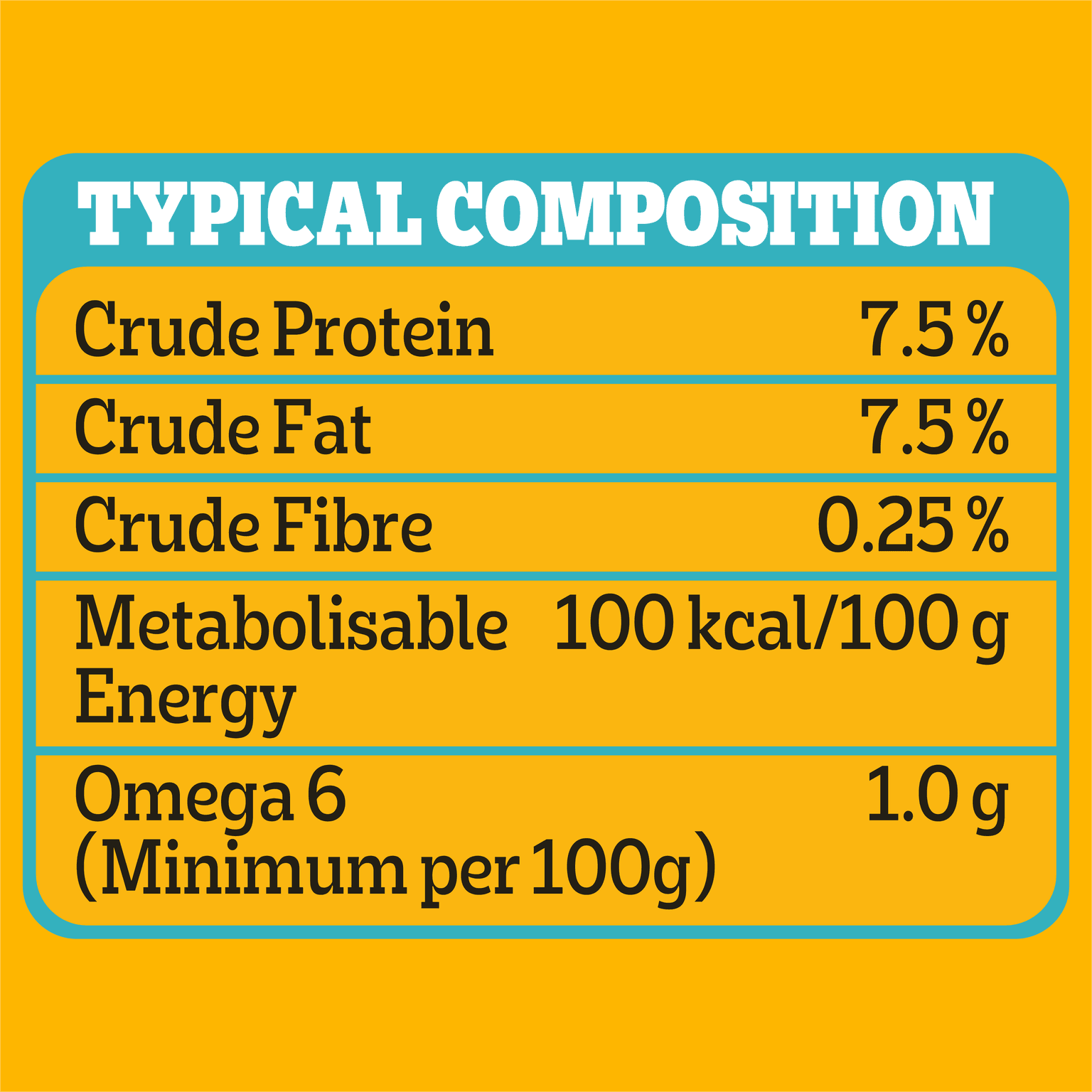 Meats (Chicken, Beef &/or Sheep &/or Pork); Rice; Vegetable Fibre; Gelling Agents; Minerals; Fish oil; Colouring Agent; Sunflower Oil, Vitamins and Flavour.