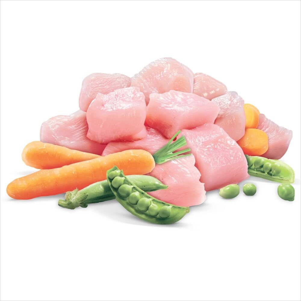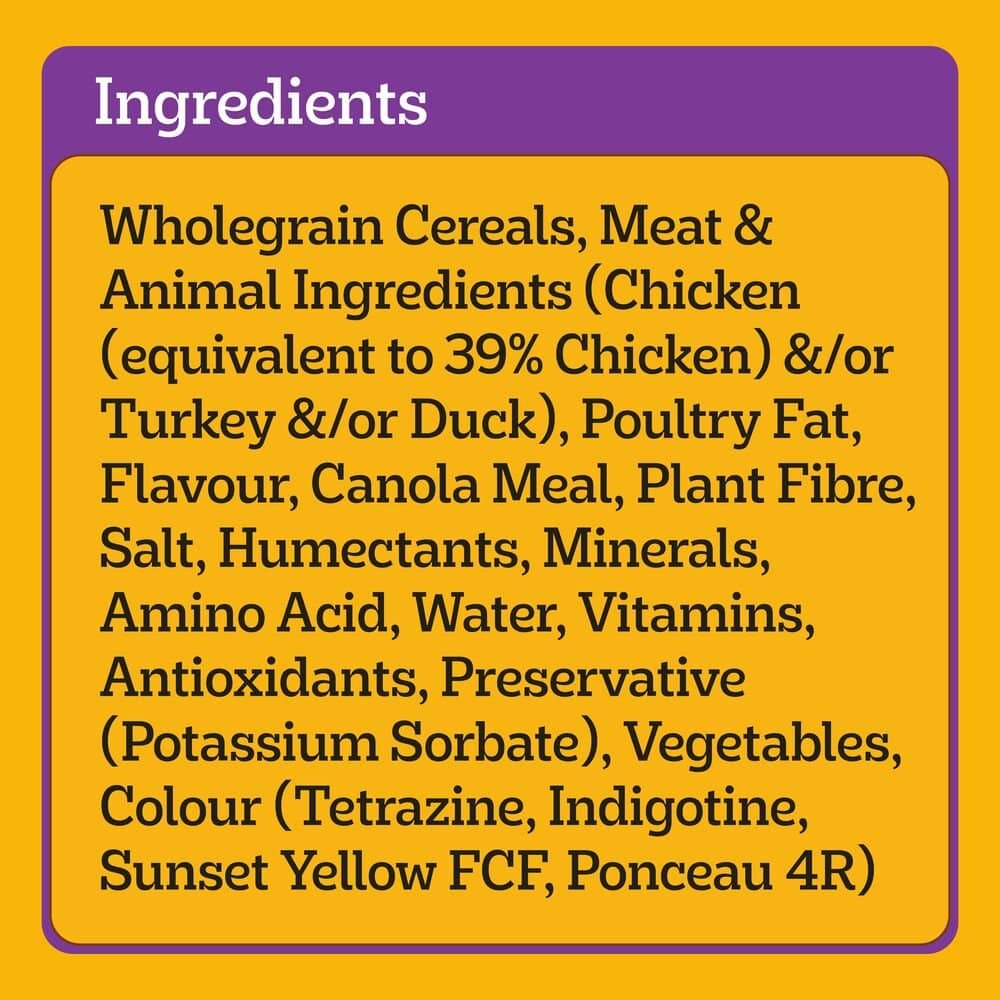 Wholegrain Cereals, Meat & Animal Ingredients (Chicken (equivalent to 39% Chicken) &/or Turkey &/or Duck), Poultry Fat, Flavour, Canola Meal, Plant Fibre, Salt, Humectants, Minerals, Amino Acid, Water, Vitamins, Antioxidants, Preservative (Potassium Sorbate), Vegetables, Colour (Tetrazine, Indigotine, Sunset Yellow FCF, Ponceau 4R)