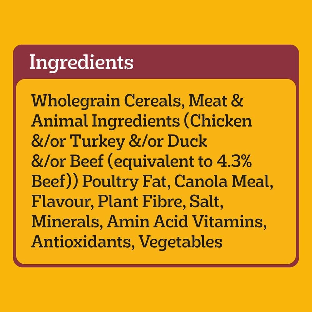 Wholegrain Cereals, Meat & Meat by-products (including Beef &/or Chicken), Natural Flavours (Chicken), Canola Meal, Beet Pulp, Salt, Vitamins & Minerals, Vegetable Oil, Amino Acid, Antioxidants, Vegetables.