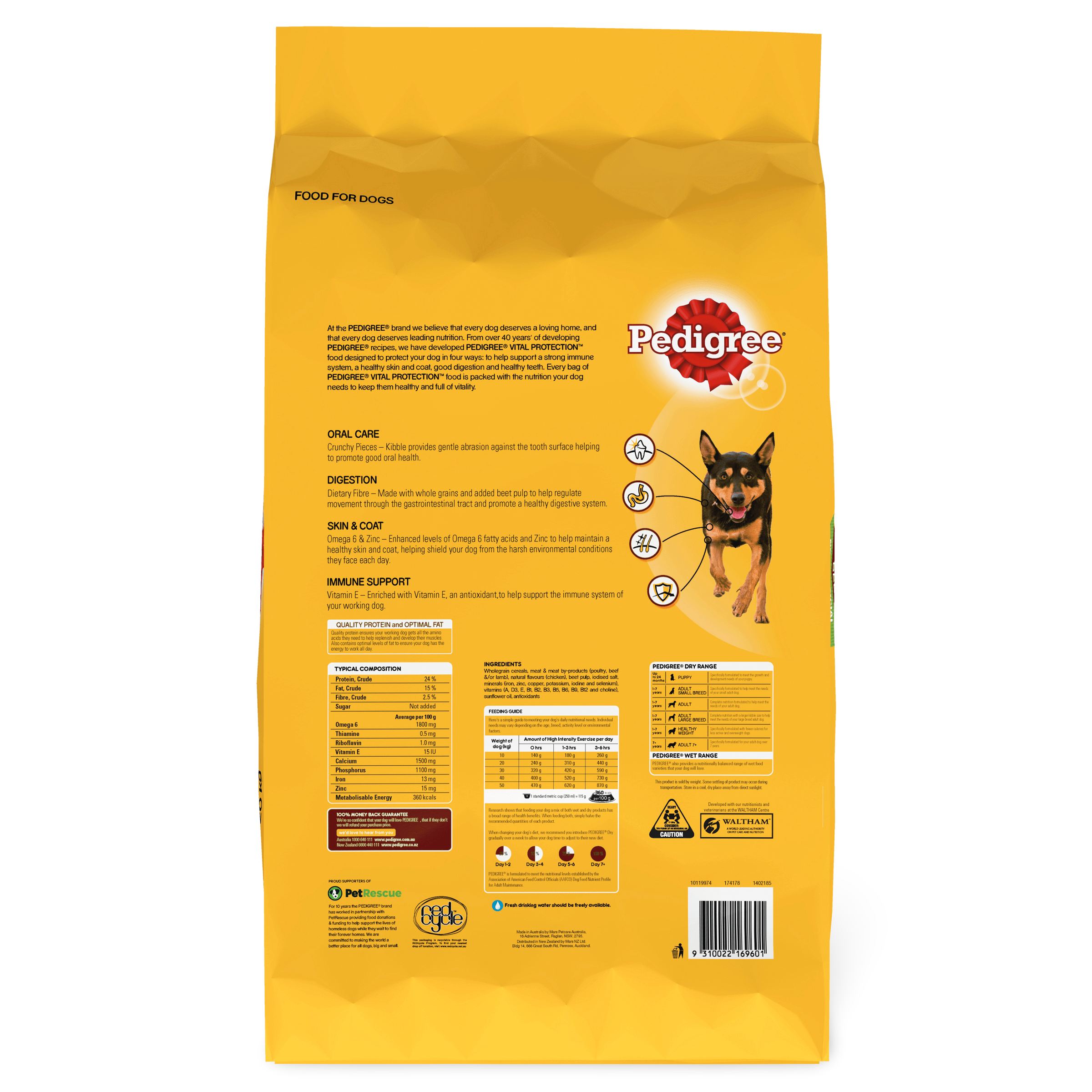 Meat & meat by-products (poultry, beef &/or lamb), wheat, wheat bran, sorghum &/or barley, poultry palatant, beet pulp, iodised salt, minerals (iron, zinc, copper, potassium and selenium), vitamins (A, D3, E, B1, B2, B3, B5, B6, B9, B12 and choline), sunflower oil, antioxidants