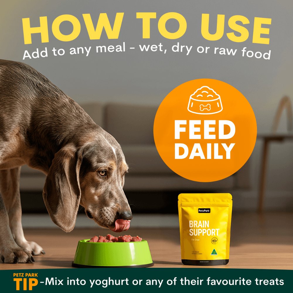 The Petz Park Brain Support supplement is a carefully formulated powder designed to nurture the cognitive functions of aging dogs with essential nutrients that foster mental clarity and brain health. Made with no fillers, no preservatives, and only natural ingredients, it is simple to use. Just sprinkle over or mix into your pet's food and use multiple PetzPark supplements together for optimal support.