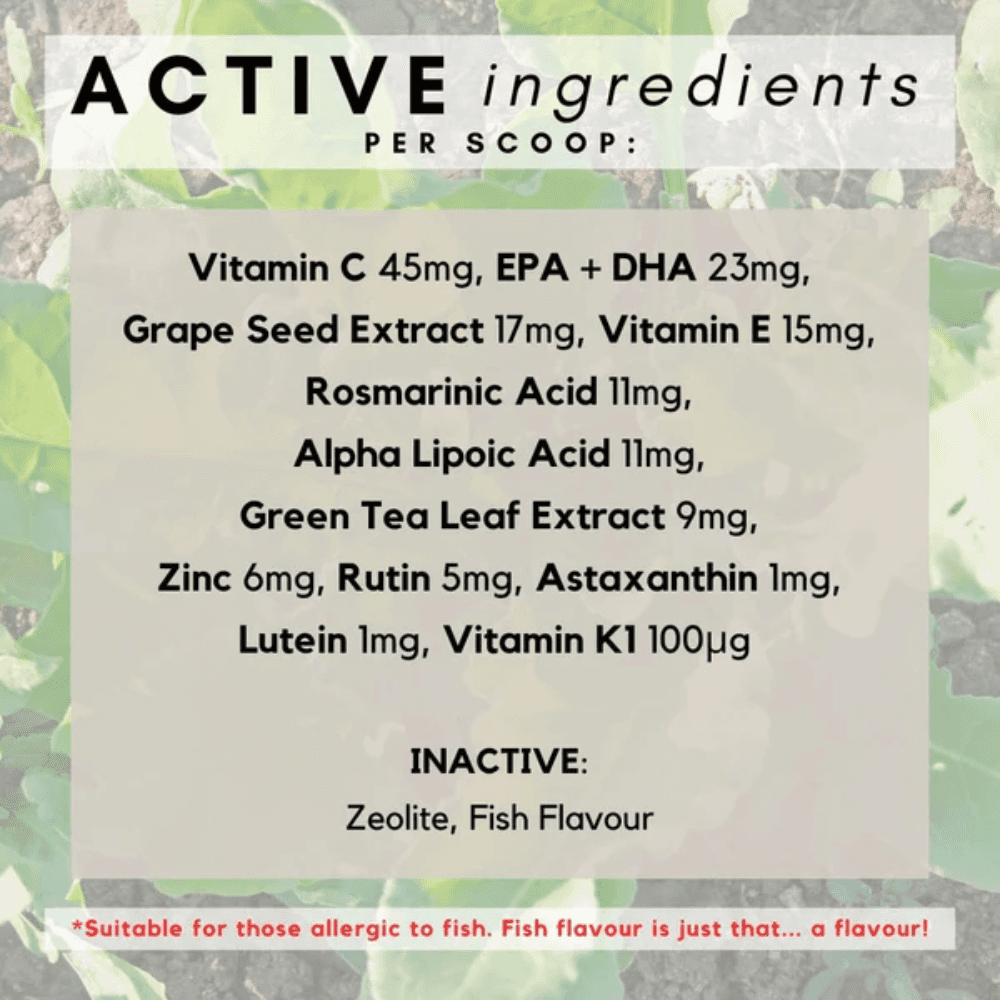 Ingredients Per Scoop - ACTIVE: Vitamin C 45mg, EPA + DHA 23mg, Grape Seed Extract 17mg, Vitamin E 15mg, Rosmarinic Acid 11mg, Alpha Lipoic Acid 11mg, Green Tea Leaf Extract 9mg, Zinc 6mg, Rutin 5mg, Astaxanthin 1mg, Luetin 1mg, Vitamin K1 100?g. Inactive: Zeolite, Fish Flavour*. *Suitable for those allergic to fish. Fish flavour is just that... a flavour!