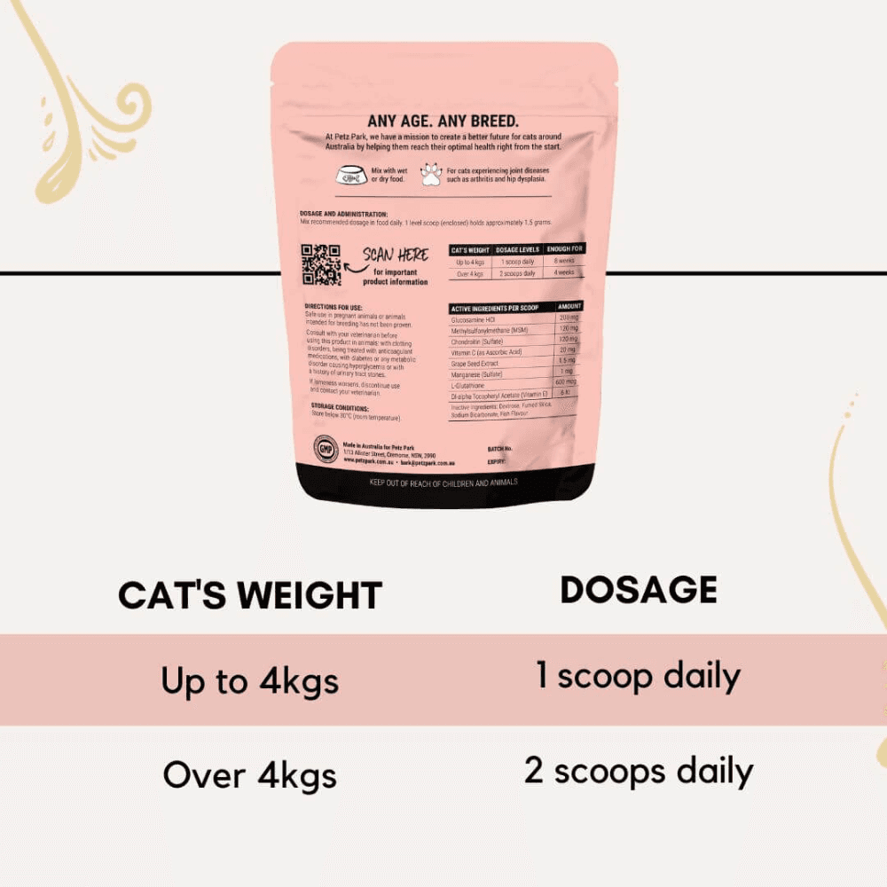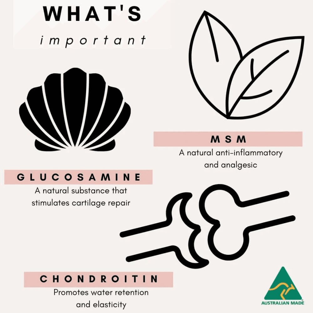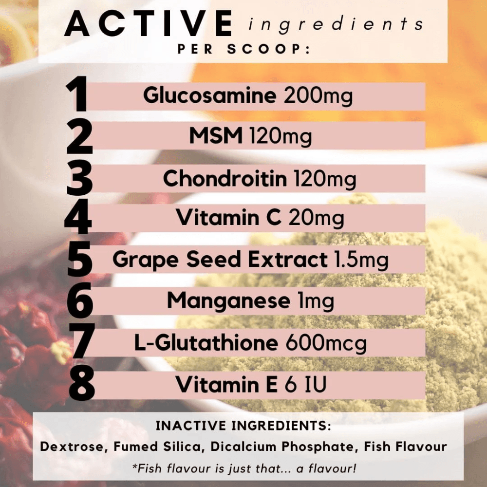Ingredients Per Scoop - ACTIVE: Glucosamine 200mg, MSM 120mg, Chondroitin 120mg, Vitamin C 20mg, Grape Seed Extract 1.5mg, Manganese 1mg, L-Glutathione 600mcg, Vitamin E 6 IU. Inactive: Dextrose, Fumed Silica, Dicalcium Phosphate, Fish Flavour*. *Fish flavour is just that... a flavour!