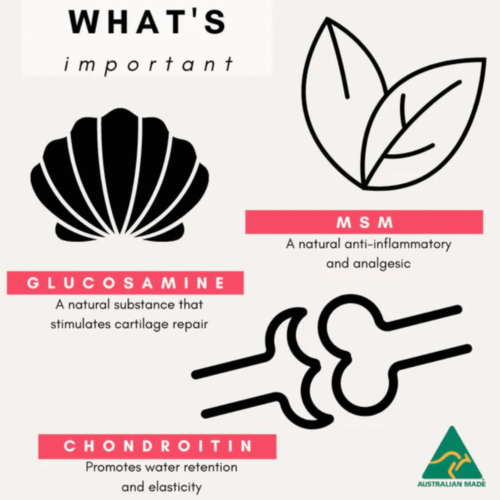 Ingredients Per Scoop - ACTIVE: Glucosamine 800mg, MSM 400mg, Chondroitin 400mg, Vitamin C 100mg, Grape Seed Extract 5mg, Manganese 2.5mg, L-Glutathione 2mg, Vitamin E 25 IU. Inactive: Dextrose, Fumed Silica, Roast Beef Flavour*, Natural Woodsmoke *Suitable for those allergic to meat. Beef flavour is just that... a flavour!