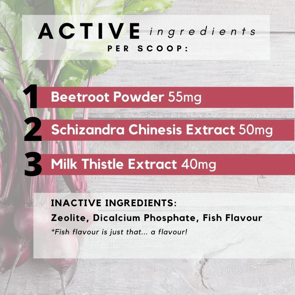 Ingredients Per Scoop - ACTIVE: Beetroot Powder 55mg, Schizandra Chinesis Extract 50mg, Milk Thistle Extract 40mg. Inactive: Zeolite, Dicalcium Phospate, Fish Flavour*. *Fish flavour is just that... a flavour!