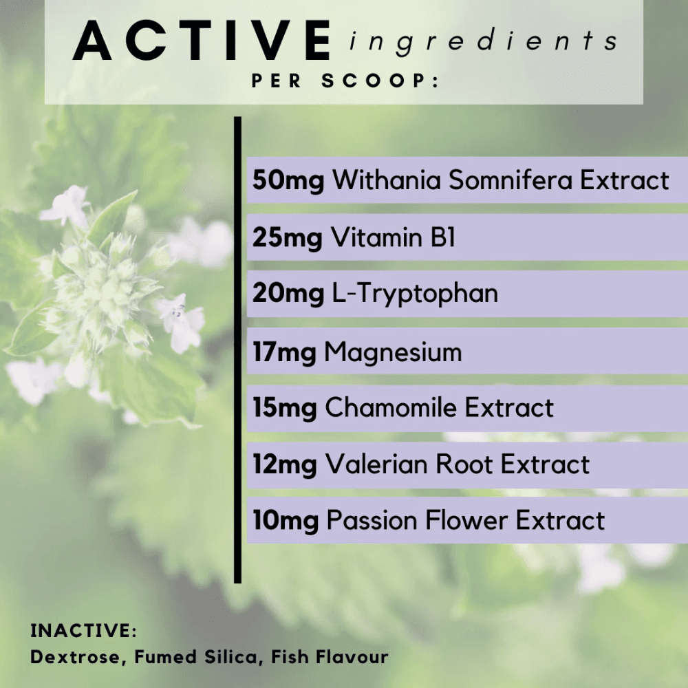 Ingredients Per Scoop - ACTIVE: Withania Somnifera Extract, Thiamine Vitamin B1, L-Tryptophan, L-Theanine, Magnesium, Chamomile, Passion Flower, Calcium, Fibre, Fish Flavour