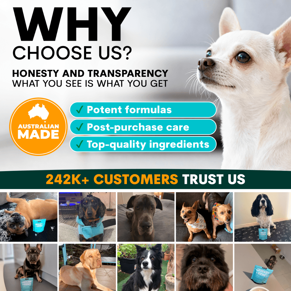 Give your dog's plumbing a helping hand with Urinary + Kidney for Dogs, an Aussie made, beef flavoured powder designed to keep their whole system flowing smoothly. Packed with cranberry to help prevent UTIs, nettle seed to calm any swelling, and marshmallow plus dandelion root to support healthy kidneys, this tasty supplement helps manage bladder stones, balance pH, and support kidney health as they age. Made with no fillers, no preservatives, and only natural ingredients, it is simple to use. Just sprinkle over or mix into your pet's food and use multiple PetzPark supplements together for optimal support.