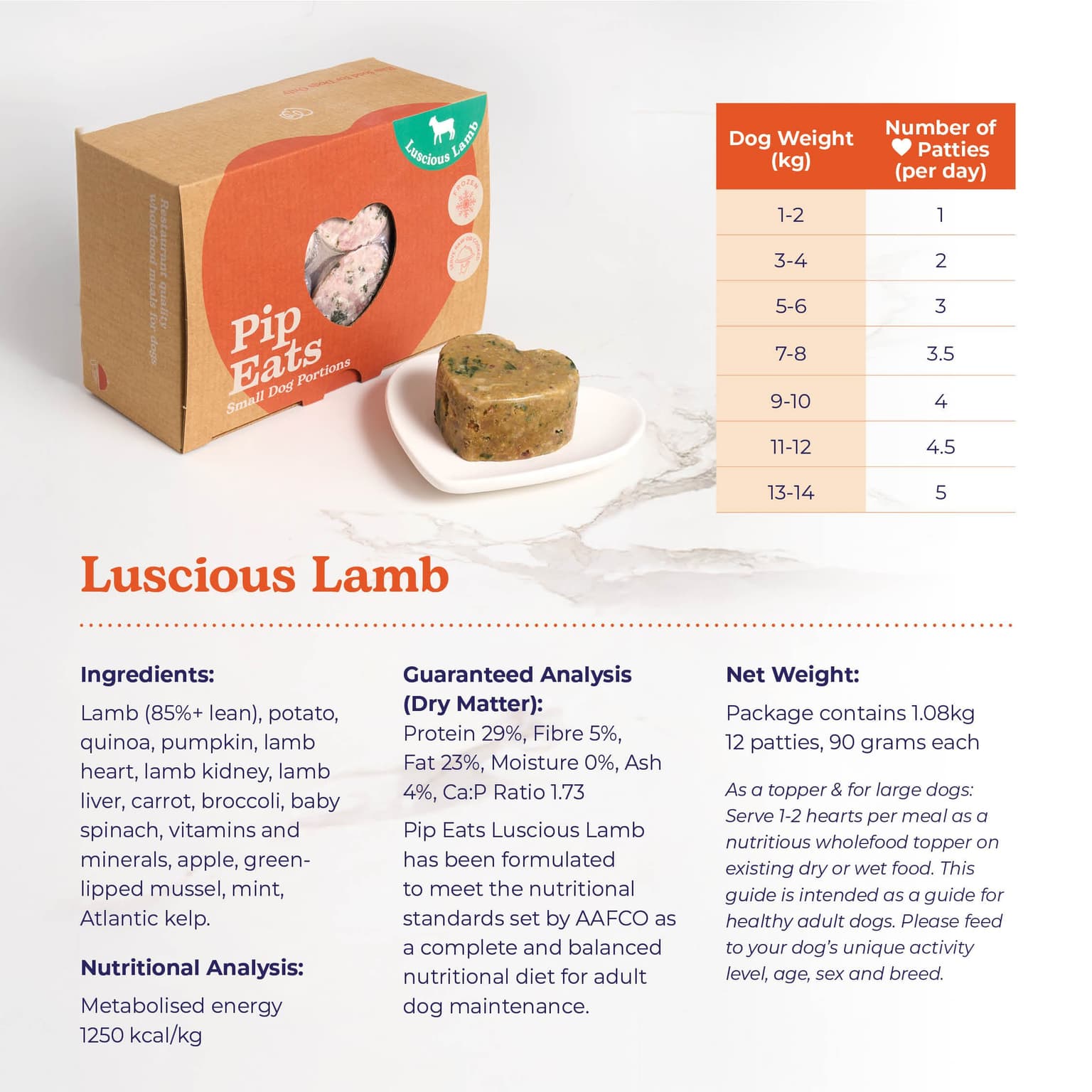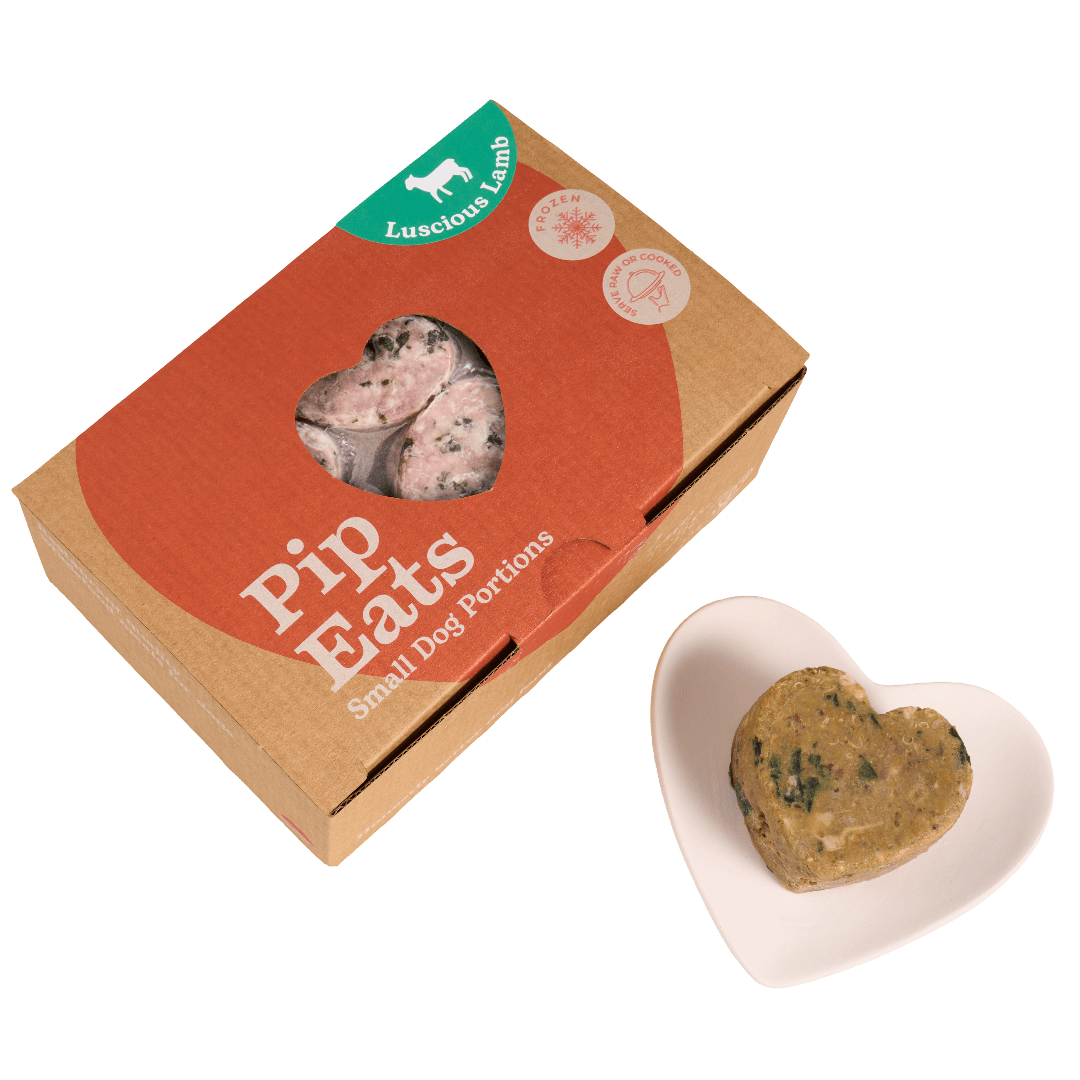 The Pip Eats Luscious Lamb Frozen Raw Dog Food provides a complete and balanced wholefood meal, expertly crafted for dogs. Formulated by a vet nutritionist with human-grade, grass-fed lamb, these convenient heart-shaped patties offer a gentle protein source in eco-friendly, compostable packaging.