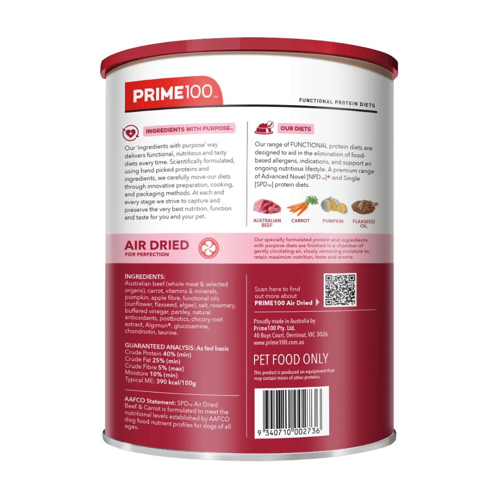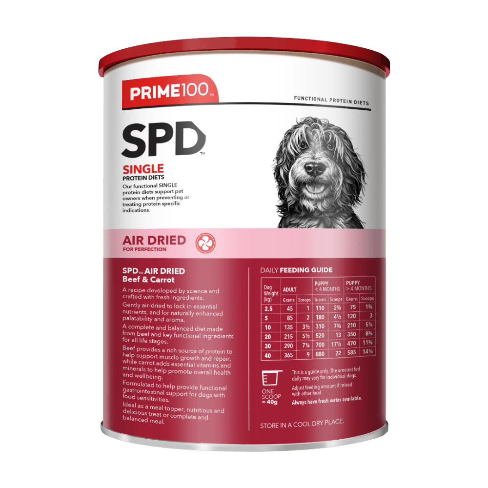 Prime100 SPD Beef & Carrot Air Dried Dog Food serves up a gently air-dried, science-crafted meal made to nourish dogs of all life stages. With premium beef, carrot, and locked-in nutrients, it supports strong muscles, happy tummies, and steady energy. It's also a top pick for sensitive floofs needing a simple, reliable, single-protein diet.