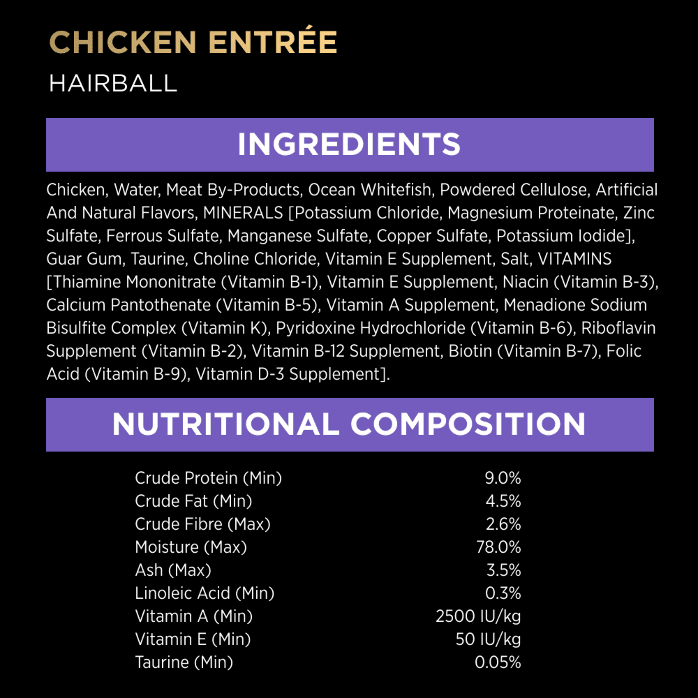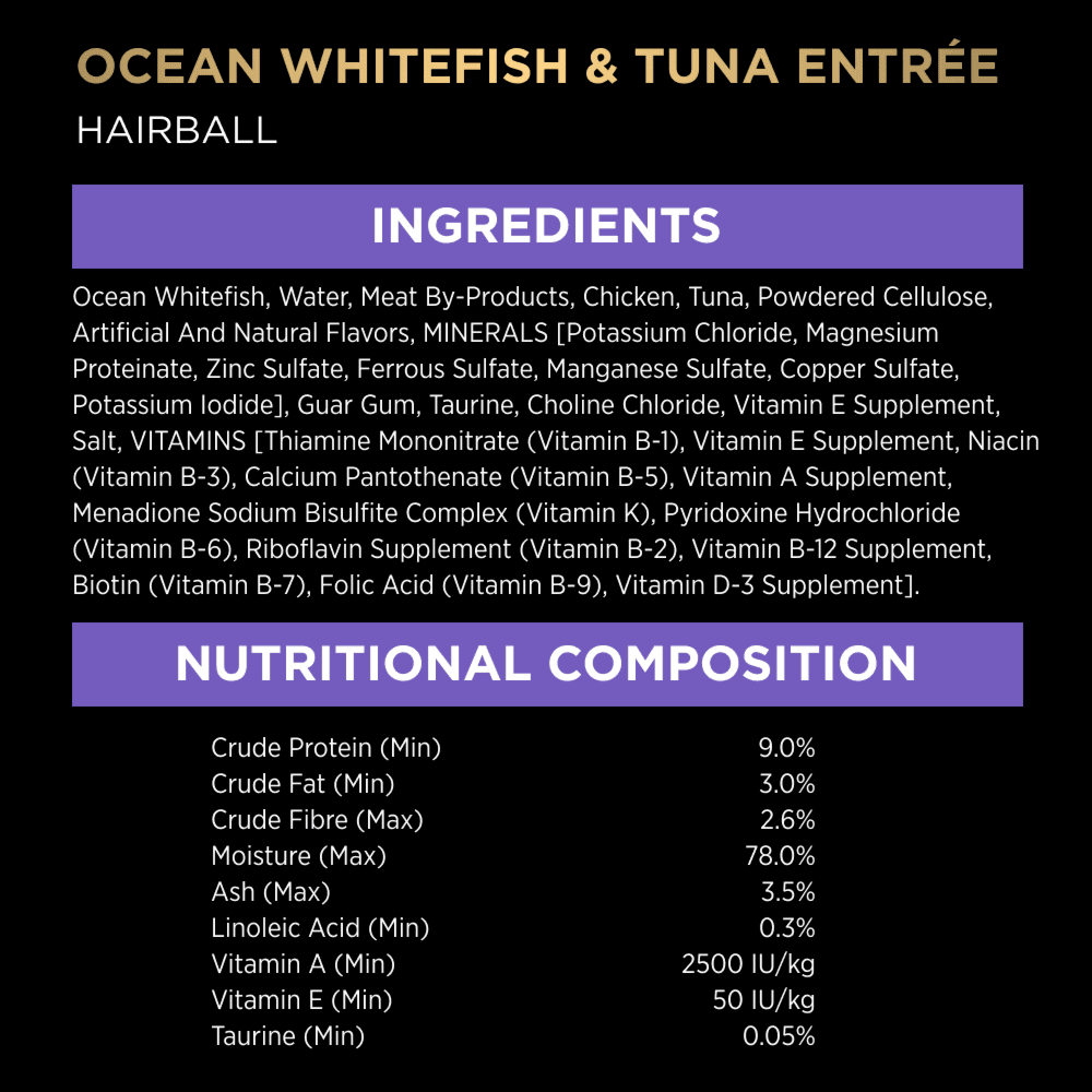 Chicken Entree: Chicken, Water, Meat By-Products, Ocean Whitefish, Powdered Cellulose, Artificial And Natural Flavors, MINERALS [Potassium Chloride, Magnesium Proteinate, Zinc Sulfate, Ferrous Sulfate, Manganese Sulfate, Copper Sulfate, Potassium Iodide], Guar Gum, Taurine, Choline Chloride, Vitamin E Supplement, Salt, VITAMINS [Thiamine Mononitrate (Vitamin B-1), Vitamin E Supplement, Niacin (Vitamin B-3), Calcium Pantothenate (Vitamin B-5), Vitamin A Supplement, Menadione Sodium Bisulfite Complex (Vitamin K), Pyridoxine Hydrochloride (Vitamin B-6), Riboflavin Supplement (Vitamin B-2), Vitamin B-12 Supplement, Biotin (Vitamin B-7), Folic Acid (Vitamin B-9), Vitamin D-3 Supplement]. Salmon Entree: Salmon, Water, Meat By-Products, Chicken, Powdered Cellulose, Artificial And Natural Flavors, MINERALS [Potassium Chloride, Magnesium Proteinate, Zinc Sulfate, Ferrous Sulfate, Manganese Sulfate, Copper Sulfate, Potassium Iodide], Guar Gum, Taurine, Choline Chloride, Vitamin E Supplement, Salt, VITAMINS [Thiamine Mononitrate (Vitamin B-1), Vitamin E Supplement, Niacin (Vitamin B-3), Calcium Pantothenate (Vitamin B-5), Vitamin A Supplement, Menadione Sodium Bisulfite Complex (Vitamin K), Pyridoxine Hydrochloride (Vitamin B-6), Riboflavin Supplement (Vitamin B-2), Vitamin B-12 Supplement, Biotin (Vitamin B-7), Folic Acid (Vitamin B-9), Vitamin D-3 Supplement]. Ocean Whitefish & Tuna Entree: Ocean Whitefish, Water, Meat By-Products, Chicken, Tuna, Powdered Cellulose, Artificial And Natural Flavors, MINERALS [Potassium Chloride, Magnesium Proteinate, Zinc Sulfate, Ferrous Sulfate, Manganese Sulfate, Copper Sulfate, Potassium Iodide], Guar Gum, Taurine, Choline Chloride, Vitamin E Supplement, Salt, VITAMINS [Thiamine Mononitrate (Vitamin B-1), Vitamin E Supplement, Niacin (Vitamin B-3), Calcium Pantothenate (Vitamin B-5), Vitamin A Supplement, Menadione Sodium Bisulfite Complex (Vitamin K), Pyridoxine Hydrochloride (Vitamin B-6), Riboflavin Supplement (Vitamin B-2), Vitamin B-12 Supplement, Biotin (Vitamin B-7), Folic Acid (Vitamin B-9), Vitamin D-3 Supplement].