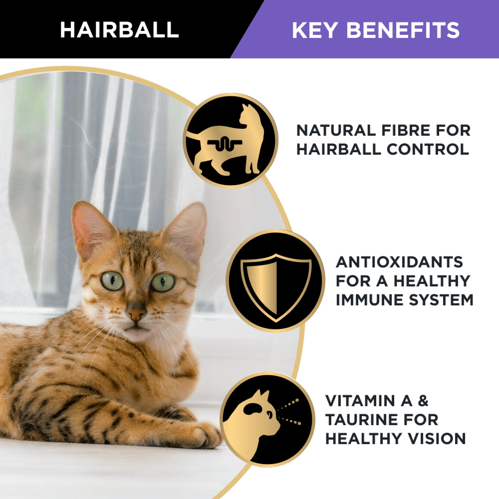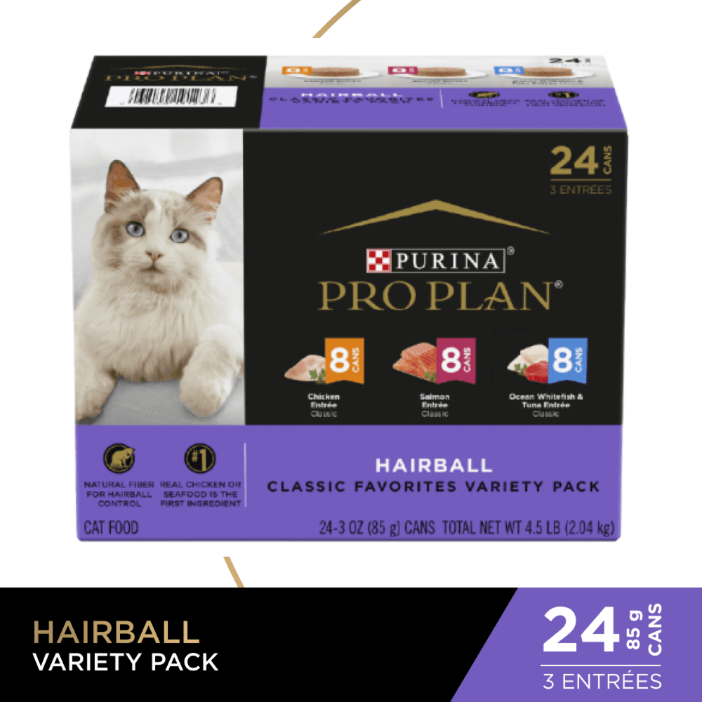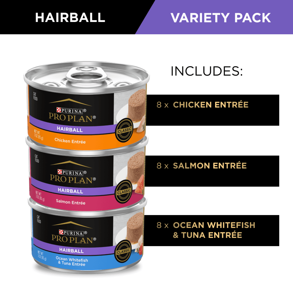 The PRO PLAN Hairball Variety Pack Wet Cat Food provides three distinct recipes scientifically formulated with natural fibre to help manage hairballs in adult cats. This variety pack includes Chicken Entree, Salmon Entree, and Ocean Whitefish & Tuna Entree, offering a taste your cat will love while supporting their specific digestive needs.
