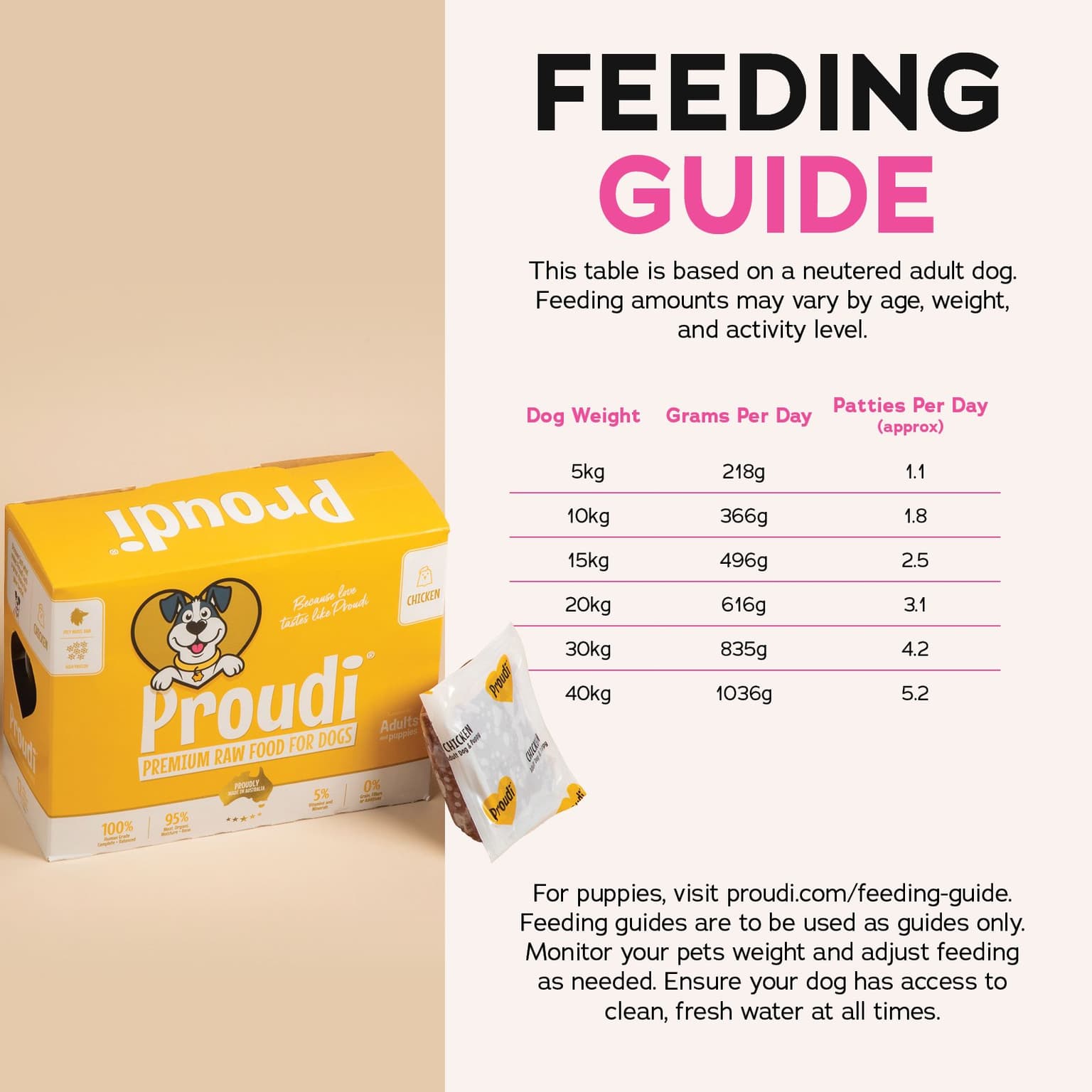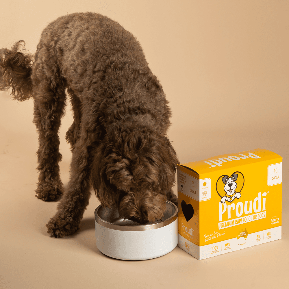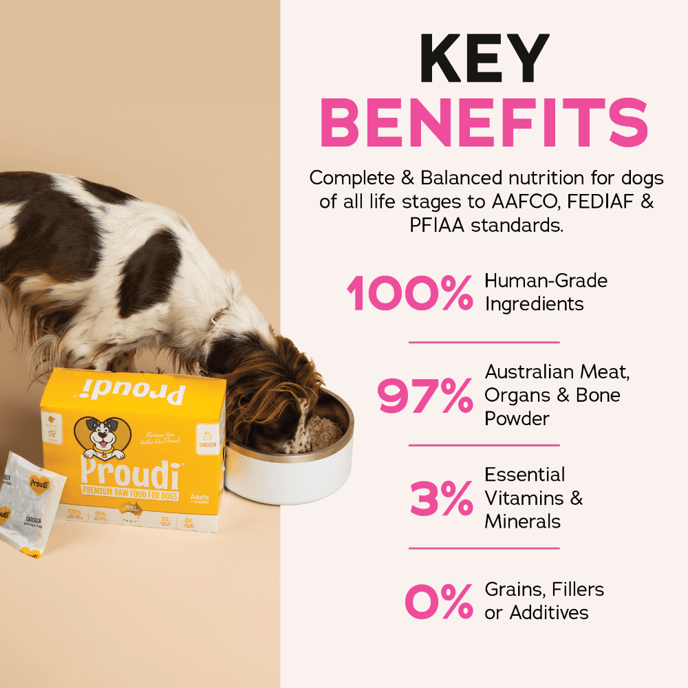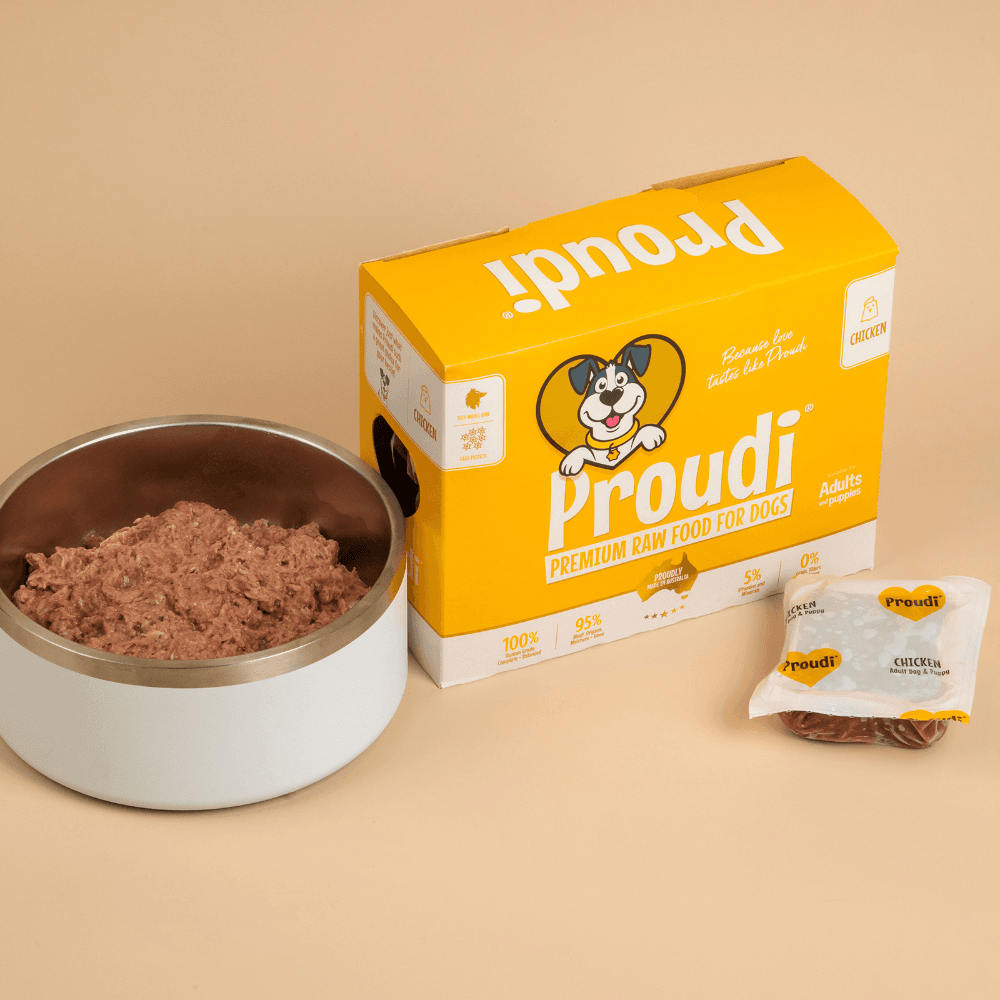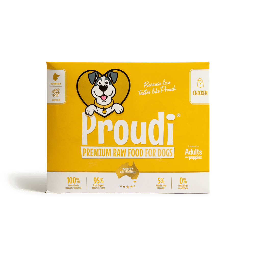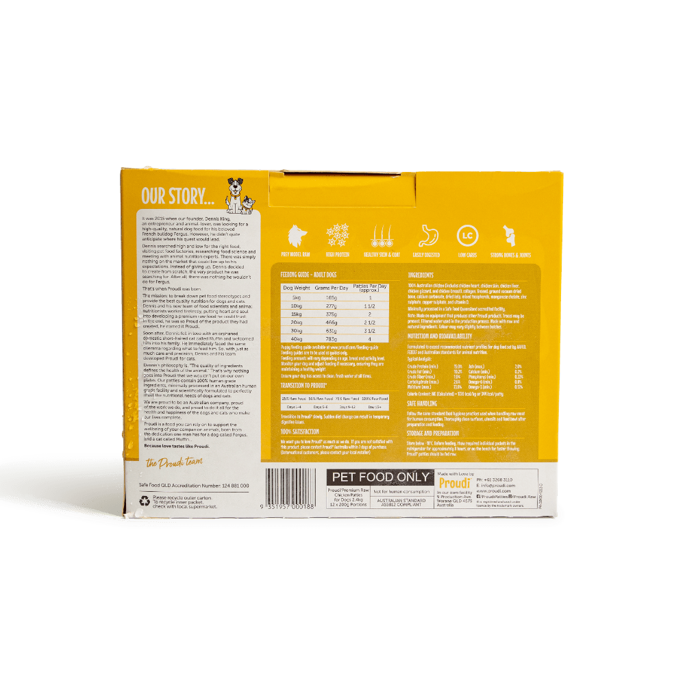 Proudi Premium Raw Chicken Frozen Dog Food Patties are a single-protein meal made from 100% human-grade, Australian chicken. This complete and balanced formula is a great all-rounder, perfect for first-time raw feeders, puppies, and chicken lovers.