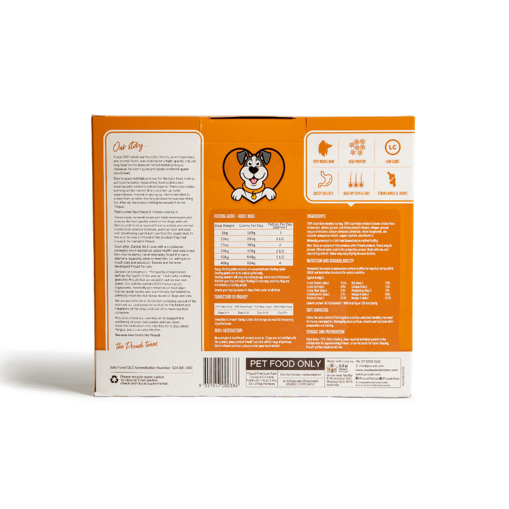 Proudi Premium Raw Turkey and Chicken Frozen Dog Food Patties are a complete and balanced meal crafted with a delicious blend of white meats. Made from 100% human-grade Australian turkey and chicken, these patties are an excellent choice for adult dogs with red meat intolerances or sensitive stomachs.