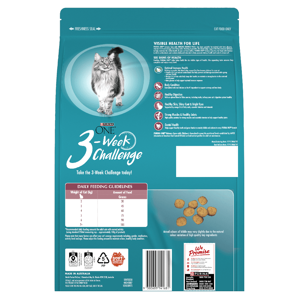 This chicken dry cat food from Purina One Urinary Care with Immune Defence Plus+ is crafted to promote your cats urinary health while tantalizing their taste buds with each meal. It is a thoughtfully balanced formula designed to maintain kidney health and control urinary pH levels.