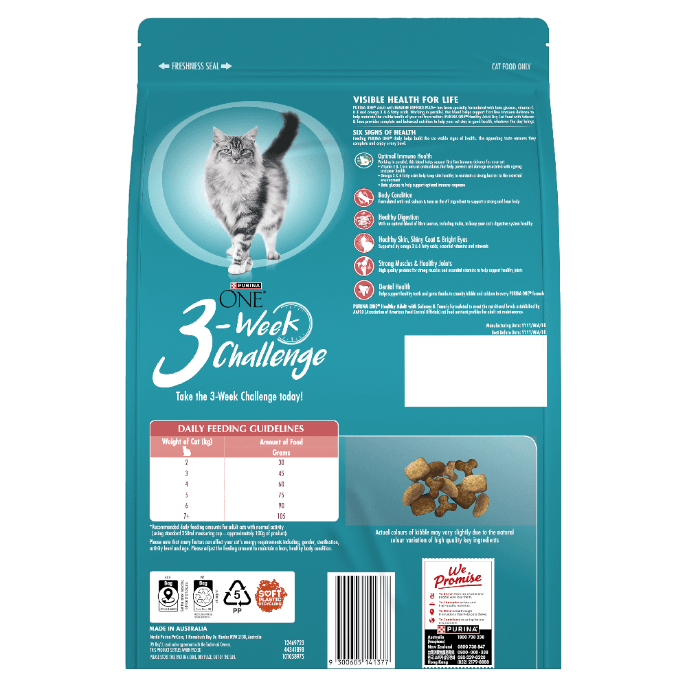 This dry cat food by Purina One, featuring Salmon and Tuna, provides adult cats with balanced nutrition and a delectable taste to keep them thriving and satisfied. Its uniquely formulated with IMMUNE DEFENCE PLUS+ to bolster your pets overall health and vitality.