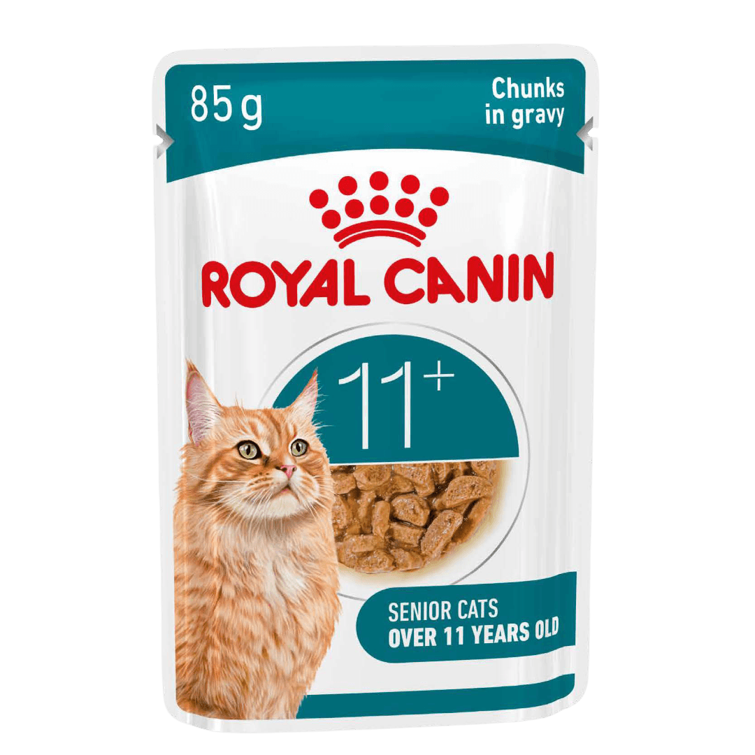 ROYAL CANIN Ageing 11+ Gravy Adult Wet Cat Food Pouches offer a complete and balanced nutritional solution specifically formulated to support the health of senior cats during their later life stages. This wet diet features tender chunks in a savoury gravy, designed to be easy for older cats to chew while delivering essential nutrients to maintain their daily vitality.