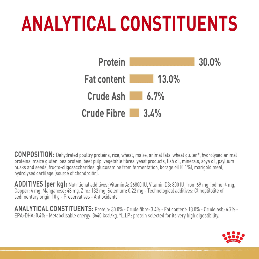 Dehydrated poultry proteins, rice, wheat, maize, animal fats, wheat gluten*, hydrolysed animal proteins, maize gluten, pea protein, beet pulp, vegetable fibres, yeast products, fish oil, minerals, soya oil, psyllium husks and seeds, fructo-oligosaccharides, glucosamine from fermentation, borage oil (0.1%), marigold meal, hydrolysed cartilage (source of chondroitin). *L.I.P.: protein selected for its very high digestibility. _________________________________________________________________________________ Additives (per kg) - Nutritional additives: Vitamin A: 26800 IU, Vitamin D3: 800 IU, Iron: 69 mg, Iodine: 4 mg, Copper: 4 mg, Manganese: 43 mg, Zinc: 132 mg, Selenium: 0.22 mg . Technological additives: Clinoptilolite of sedimentary origin 10 g. Preservatives - Antioxidants. _________________________________________________________________________________ Please Note: Royal Canin takes pride in ensuring the scientific reliability of all product information. The information in this product listing was true and accurate at the time of publication. However, please note that from time to time, for example due to ingredient availability or a change in sourcing factory within our global factory network for the purpose of ongoing supply, it is necessary to make product changes at short notice, and there may be some delays in updating the information in our product materials.