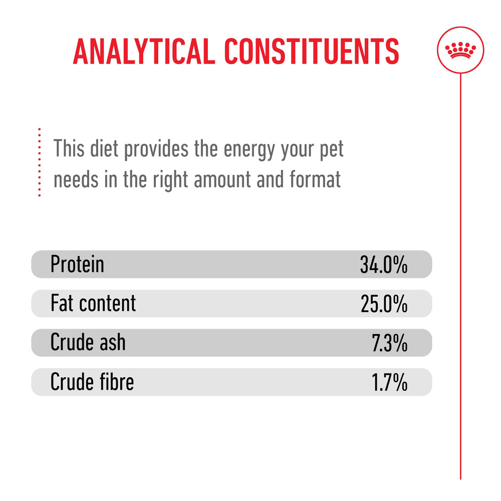 Dehydrated poultry protein, animal fats, maize flour, wheat gluten*, rice, hydrolysed animal proteins, yeast products, beet pulp, vegetable fibres, soya oil, minerals, fish oil, fructo-oligosaccharides, hydrolysed yeast (source of manno-oligosaccharides and betaglucans) (0.30%), algal oil Schizochytrium sp. (source of DHA), marigold meal. * L.I.P.: protein selected for its very high digestibility. _________________________________________________________________________________ Additives (per kg): Nutritional additives: Vitamin A: 25500 IU, Vitamin D3: 1000 IU, Iron: 33 mg, Iodine: 3.3 mg, Copper: 10 mg, Manganese: 43 mg, Zinc: 130 mg, Selenium: 0.04 mg. Technological additives: Clinoptilolite of sedimentary origin: 5 g. Preservatives - Antioxidants. _________________________________________________________________________________ Please Note: Royal Canin takes pride in ensuring the scientific reliability of all product information. The information in this product listing was true and accurate at the time of publication. However, please note that from time to time, for example due to ingredient availability or a change in sourcing factory within our global factory network for the purpose of ongoing supply, it is necessary to make product changes at short notice, and there may be some delays in updating the information in our product materials.